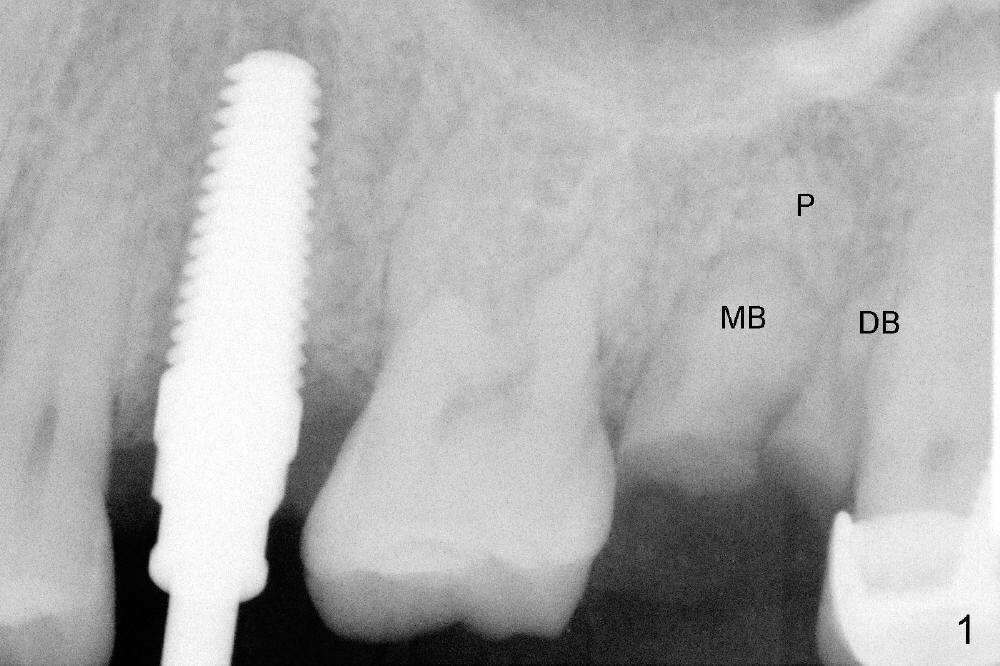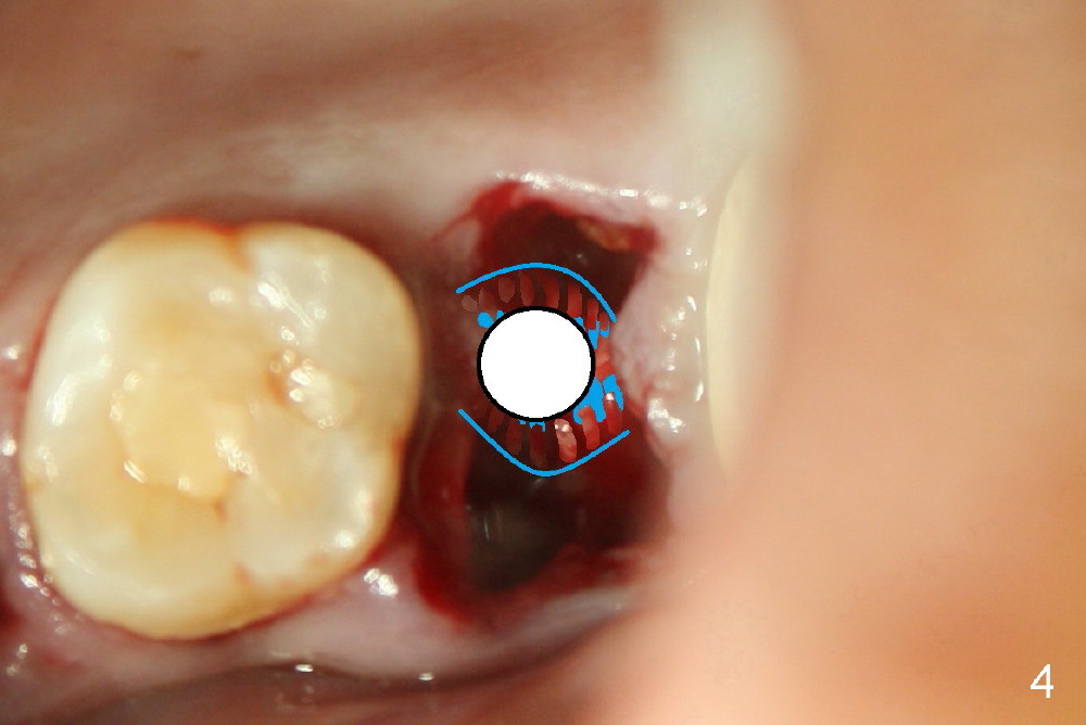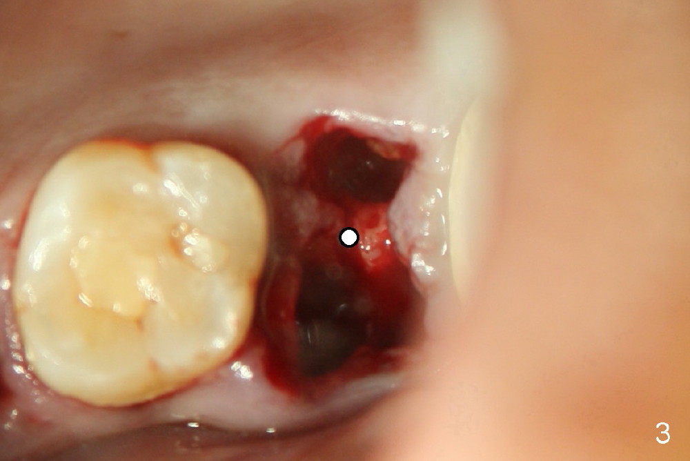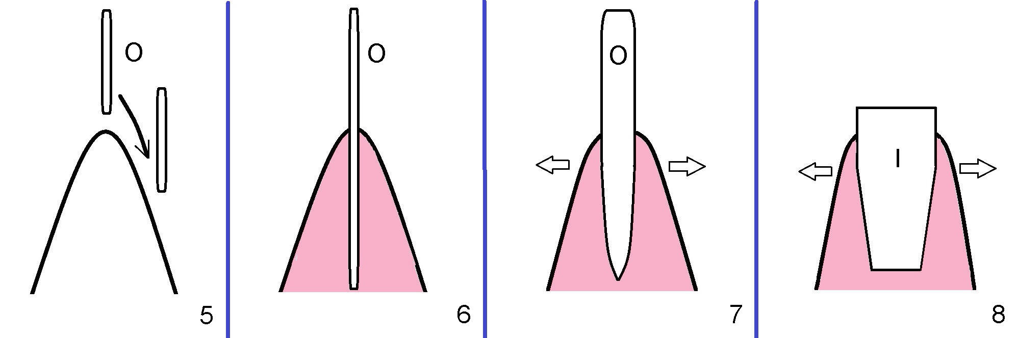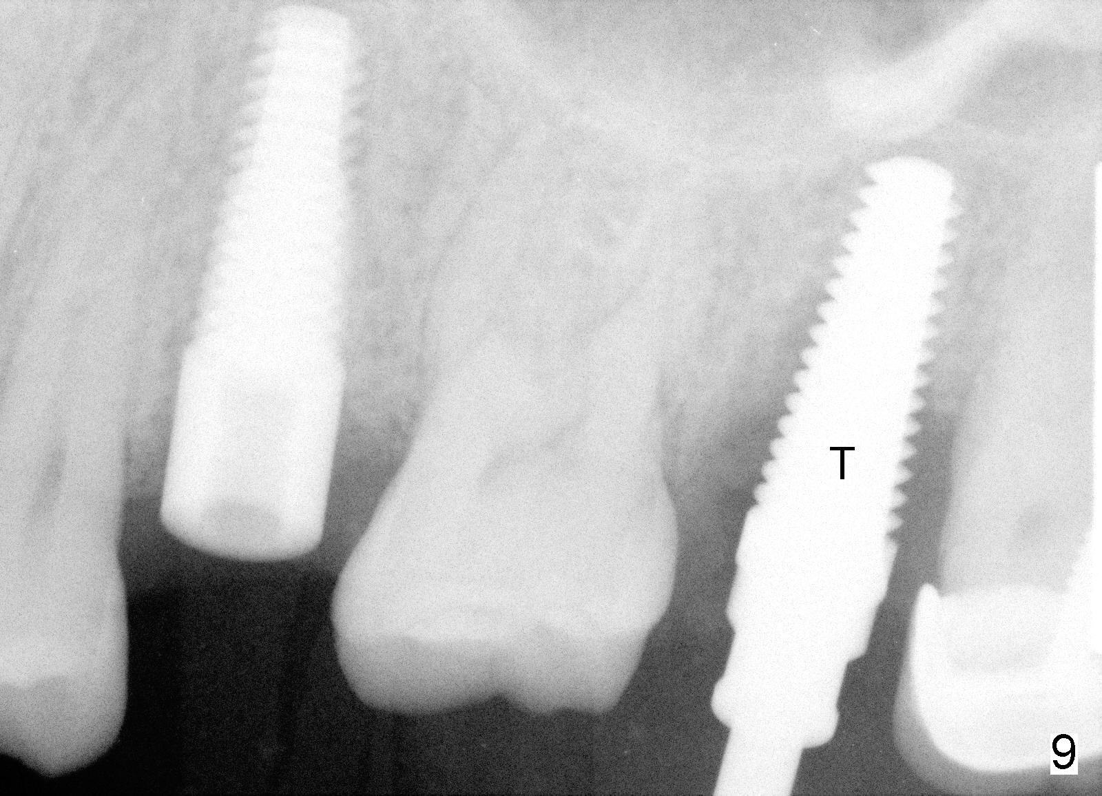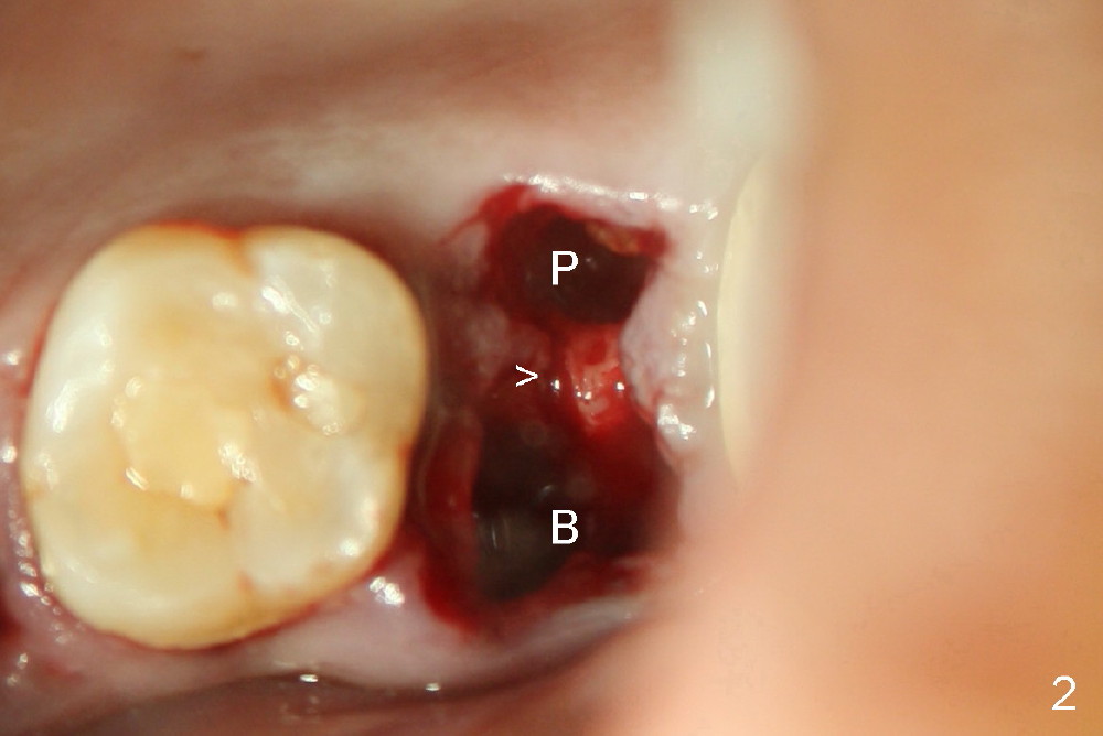 A 43-year-old lady has multiple nonsalvageable teeth. The first surgery involves two immediate implants in the upper left sextant (Fig.1: #13 and 15). The tooth #15 has 3 residual roots (MB, DB, P). There is no septum left between the first two roots when the tooth is extracted. A septum exists between the palatal (P) and buccal (B) sockets (Fig.2). Bone expansion technique is utilized to create an osteotomy in the septum. However, the smallest rounded tapered osteotome cannot be driven into the narrow septum; it slides (Fig.5). To get an initial engagement, a slot is created by high-speed surgical handpiece and fissure bur on the top of the septum. A series of blade-like osteotomes are inserted into the septum for sectioning (Fig.2 >). The smallest rounded osteotome is now easy to be inserted into the middle of the septum (Fig.3 circle, Fig.6 O). The septum is expanded by larger osteotomes (Fig.4 white circle; Fig.7 O) and tap (Fig.9 T). The septum continues being expanded when a 6x14 mm implant is placed (Fig.8,10 I). The insertion torque is more than 60 Ncm. No bone graft is placed. The palatal gap is closed by a palatal flap.