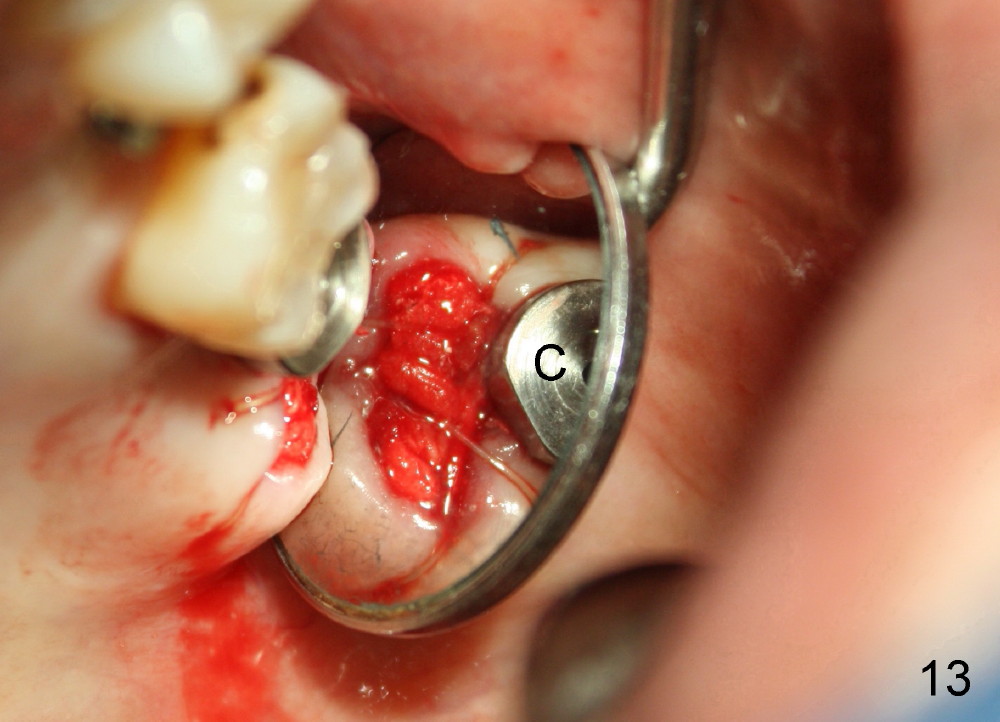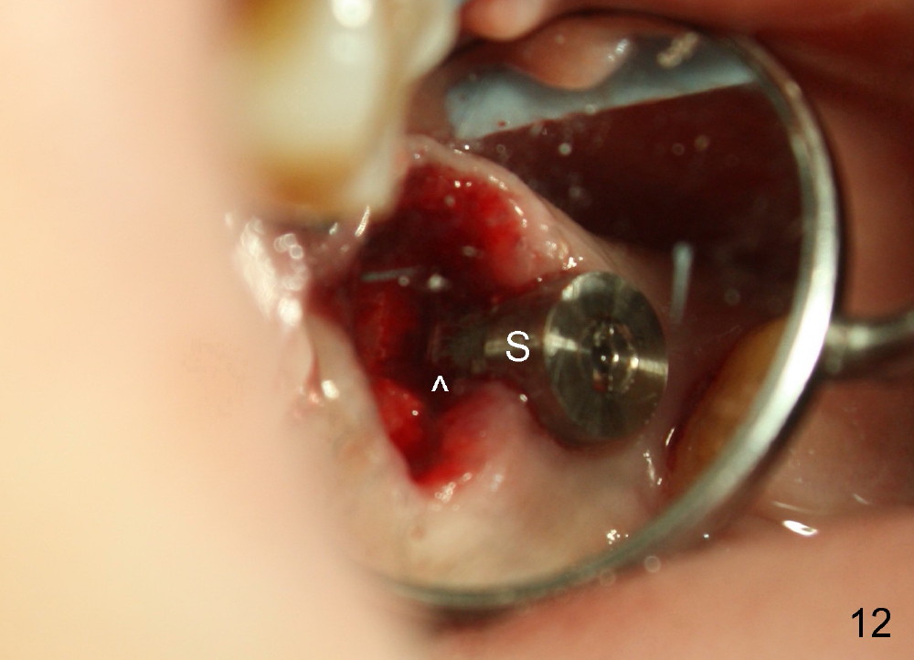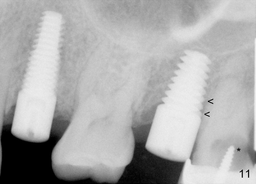 Postop, the patient has a car accident. She does not return for followup until 11 months later. The implant is stable. The neighboring third molar has caries (Fig.11 *). When it is extracted, the distal threads of the implant are found to be exposed (apical to ^ in Fig.12). A synthetic bone graft is placed to cover the exposed threads, followed by insertion of a collagen plug (Fig.13).