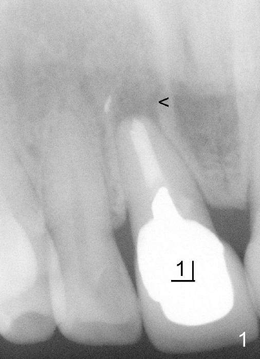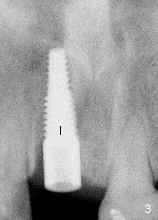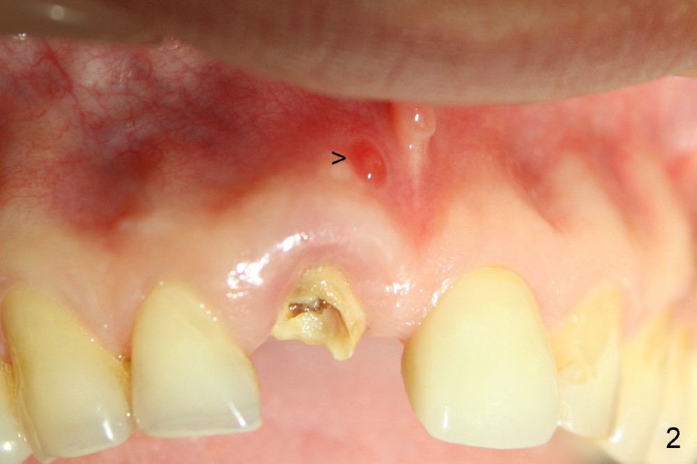 其实临床情况千变万化,处理方法可以有所变化。朱女士六十来岁,后牙缺失严重,右上中切牙根管治疗重做后感染复发(图一*:根尖阴影),但是没有任何症状,不久牙冠脱落,根尖瘘道(图二箭头)。估计炎症不是那么严重,拔牙后,常规牙槽窝处理,开始即刻植牙。处理颊侧根尖缺失办法,不是植骨,理由是植骨和植牙同时进行,增加身体负担,它们都是异物。