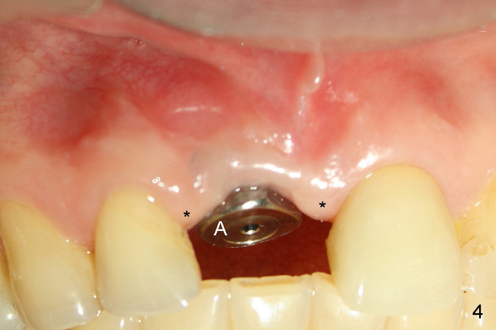 好了,让我们看结果。图三显示即刻植牙,六个月后根尖瘘道消失(图四),愈合基台(healing abutment)近远中牙龈乳头(*)与术前没有多大区别,说明即刻植牙在愈合中维持牙龈外形。今后牙龈谅比正常,我们下次见。