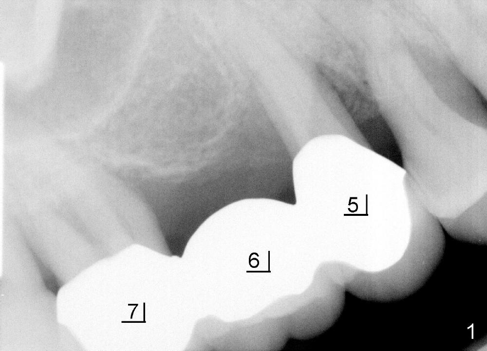 五十来岁郑先生有两个主诉:第一,左上桥松动(图二,五),要求拔除后面基牙;第二,右下六号牙处需要植牙(图三)。初步检查几张根尖片(图一至五),他是典型牙周病病人,悲观人认为不治之症,乐观人却认为这是最好植牙病例,虽然骨质吸收严重,但是剩下骨质坚硬,因为牙周病病人往往咬合力很大。充分利用剩余骨质吧。现在他口腔卫生不差。