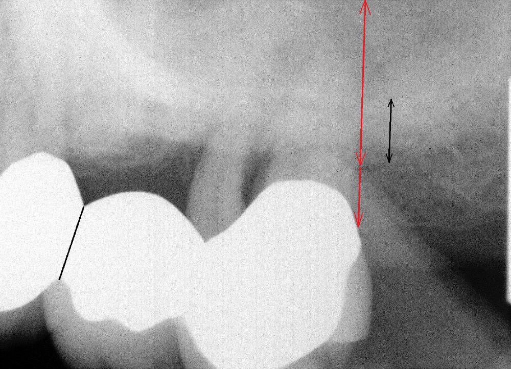 病人要求先处理左上桥(图二,五),我们准备在五六号牙之间切断桥(图六:黑线),拔除七号牙,立刻植牙。那里骨头高度多少?是黑线,还是红线?一两天我们就会给您答复。估计在那里可以植入七或者八乘十一或者十四毫米植牙。