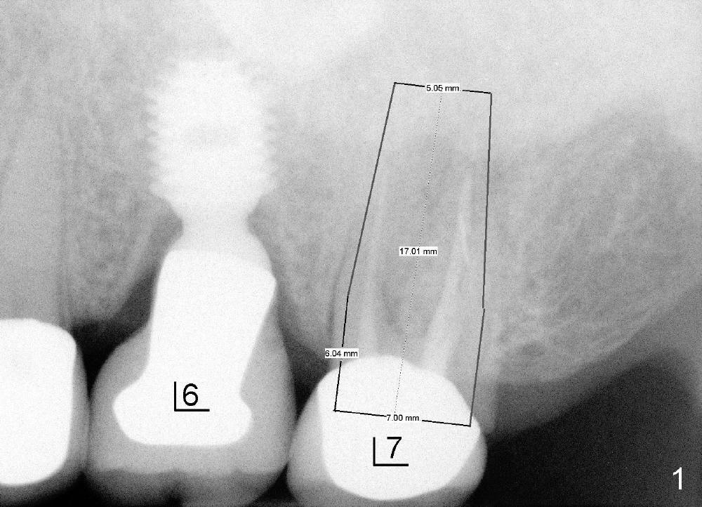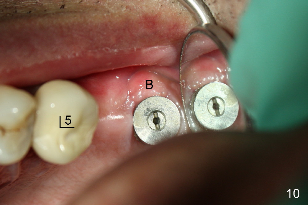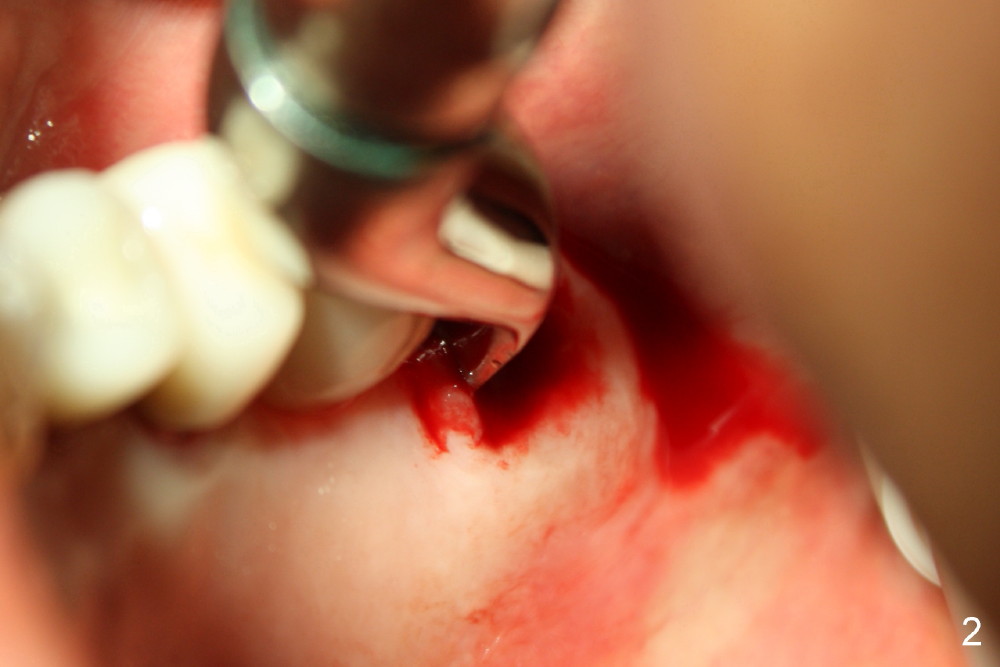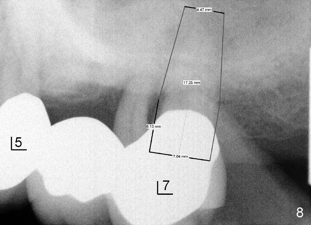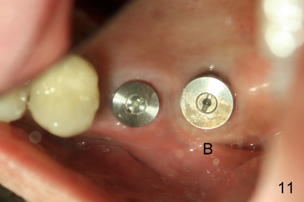 两周后郑先生也需要拔除左上第二磨牙即刻植牙(图八),植牙窝在中隔偏向颊侧开始(图七D蓝圆圈,与图七B对比),虽然植牙窝扩大过程中也逐渐向鄂侧移动,但是最后植牙基本落入拔牙窝中间(图七E粉红色圆圈,图九(术后四天),图十(术后一个月),图十一(三个月;第一磨牙植牙一周))。
