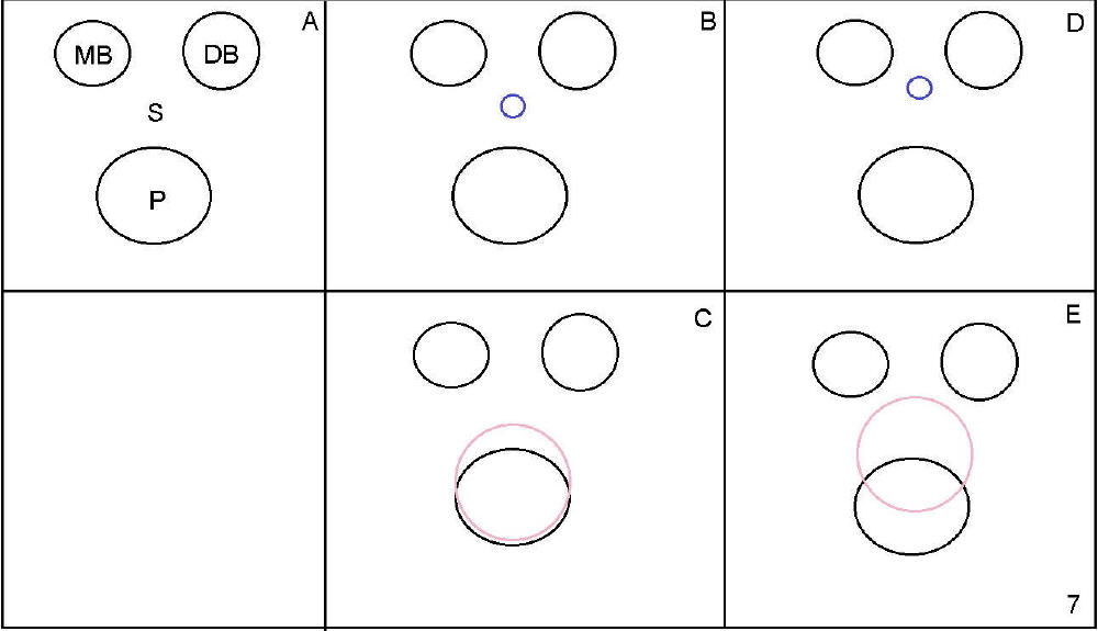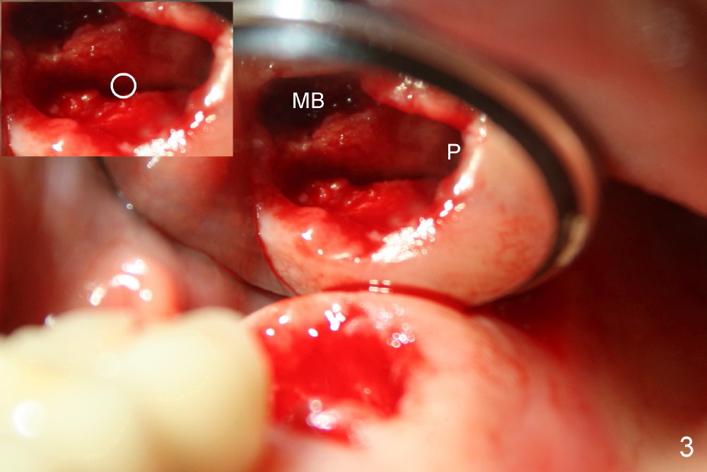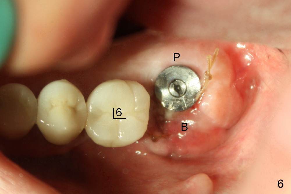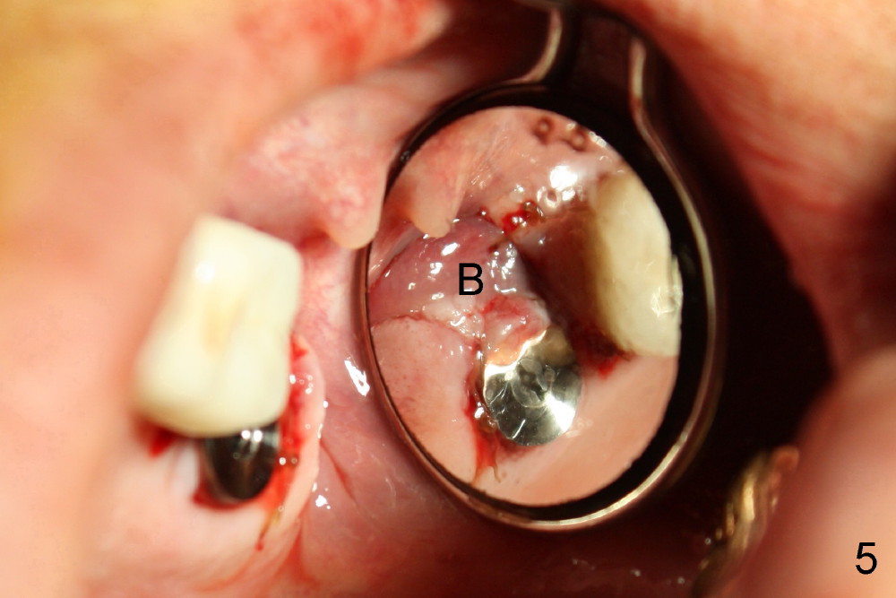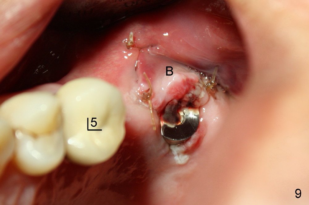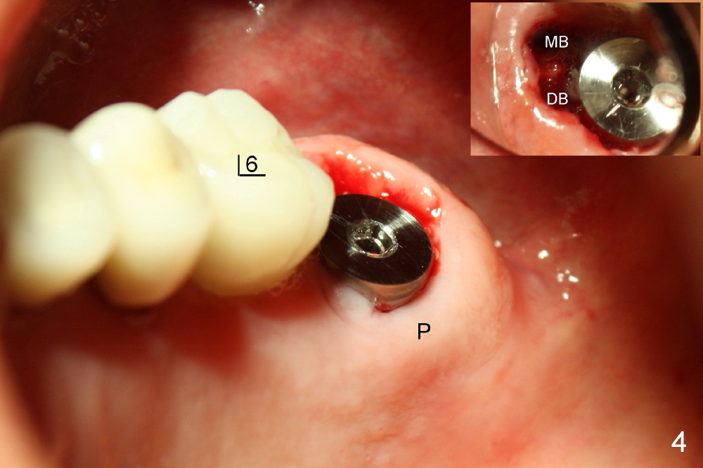 上颌磨牙有三个牙根,拔牙后一般有三个牙槽窝(图七(示意图)A:MB:近中颊侧;DB:远中颊侧;P:鄂侧),三个牙槽窝之间便是中隔(S)。如果中隔上面上颌窦不低,种植体应该种在中隔中。翁先生左上第二磨牙(图一:7)就与上颌窦无关,似乎后者不存在,前者牙根折裂,拔除后发现中隔鄂侧是一个斜坡,不容易插入圆骨凿或者钻头,所以用扁骨凿(图二)将中隔沿颊鄂侧劈开(图三),然后容易在中隔当中插入圆骨凿(图三插图白圆圈;图七B:蓝圆圈),由于中隔鄂侧阻力小,最后植牙(图七C:粉红色圆圈)不由自主地掉入鄂侧(图四),不得不移动颊侧粘骨膜瓣(图五B)关闭颊侧牙槽窝(图四插图(镜影观):MB;DB),图六镜影观(术后七天)显示种植体明显偏向鄂侧(P),可能造成以后修复困难。