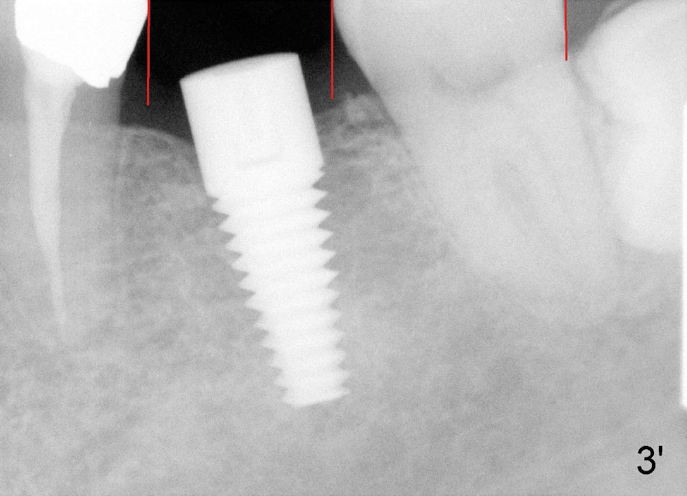 图三’:一般第一磨牙比第二宽(近远中,红线之间),但是这个病例,正好相反,说明第一磨牙缺失许久,邻牙向缺牙倾斜,移位。
