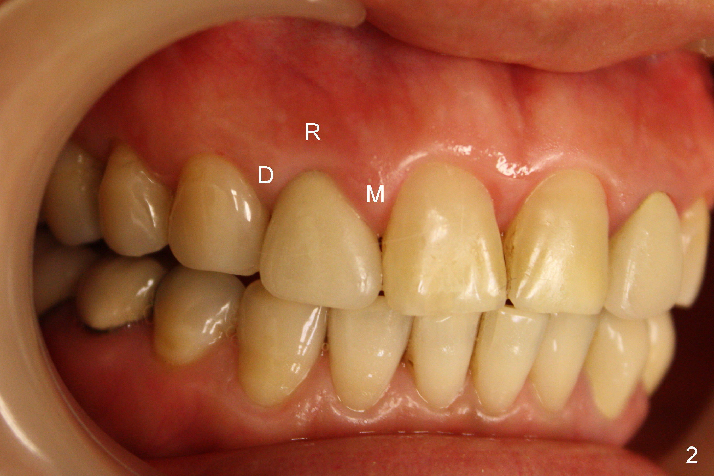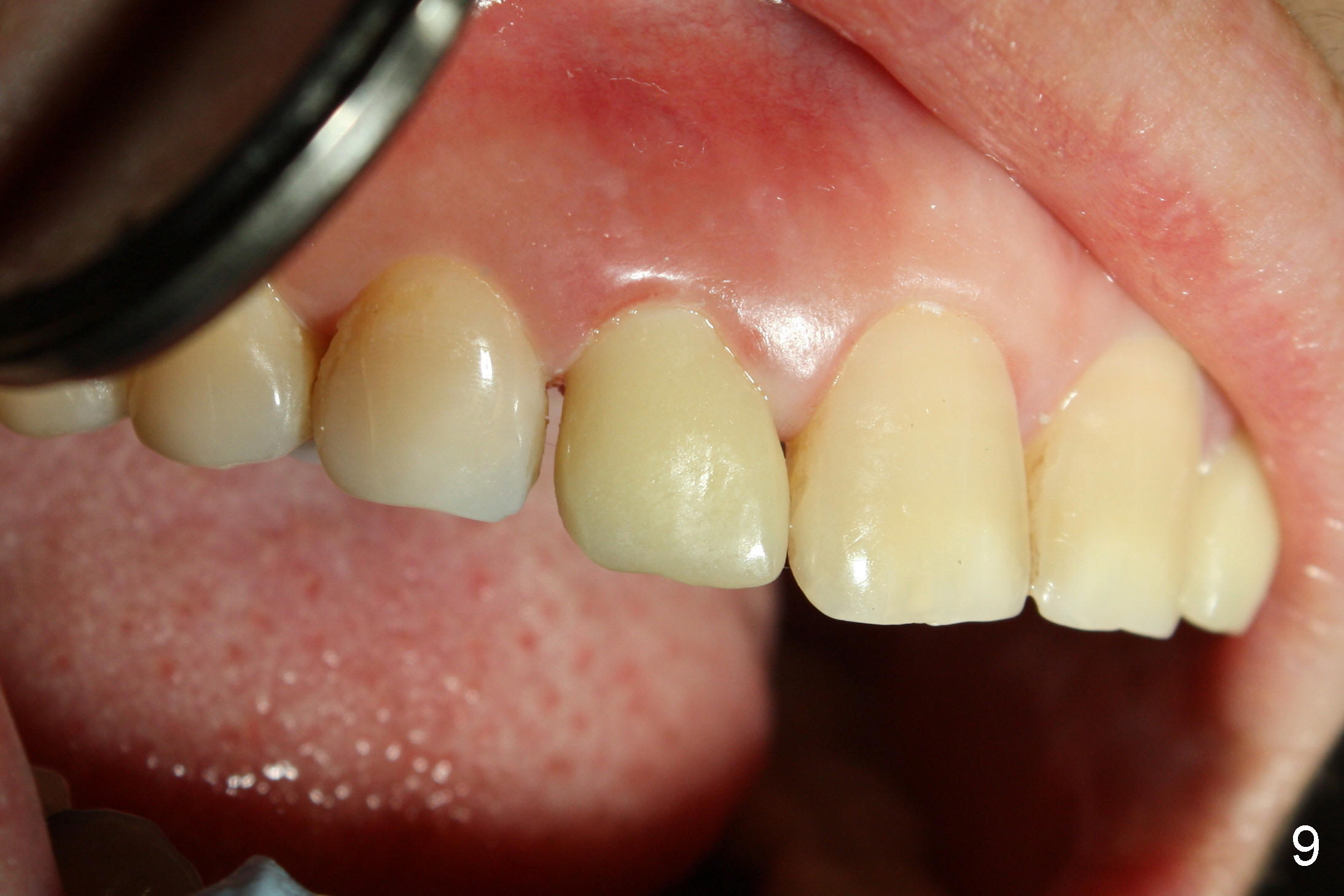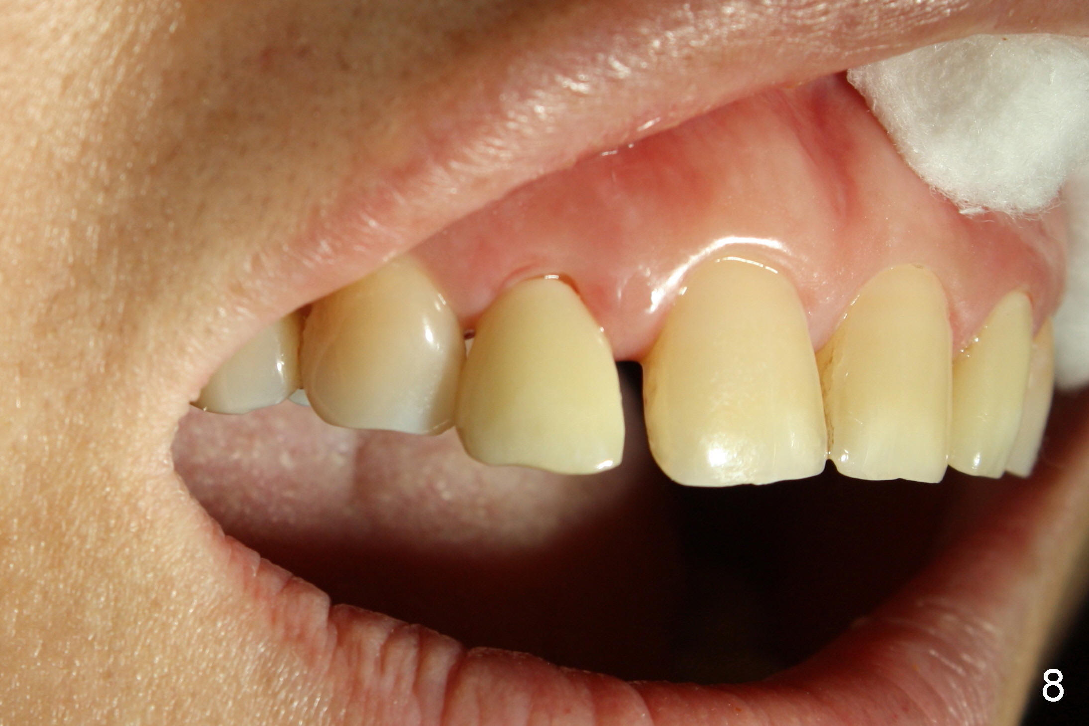 不过事与愿违,临时牙冠颜色不佳(图五,六,七)。制作临时牙冠让我们意识到七号牙原来牙冠问题:由于近中乳头(图二:M)比远中(D)大,牙根(R)偏向远中,苗条牙冠(临时)势必靠近远中(图六)。当时病人没有什么意见,当最终牙冠试戴时(图八),病人要求空隙放在远中,我们就那样做(图九,Emax)。