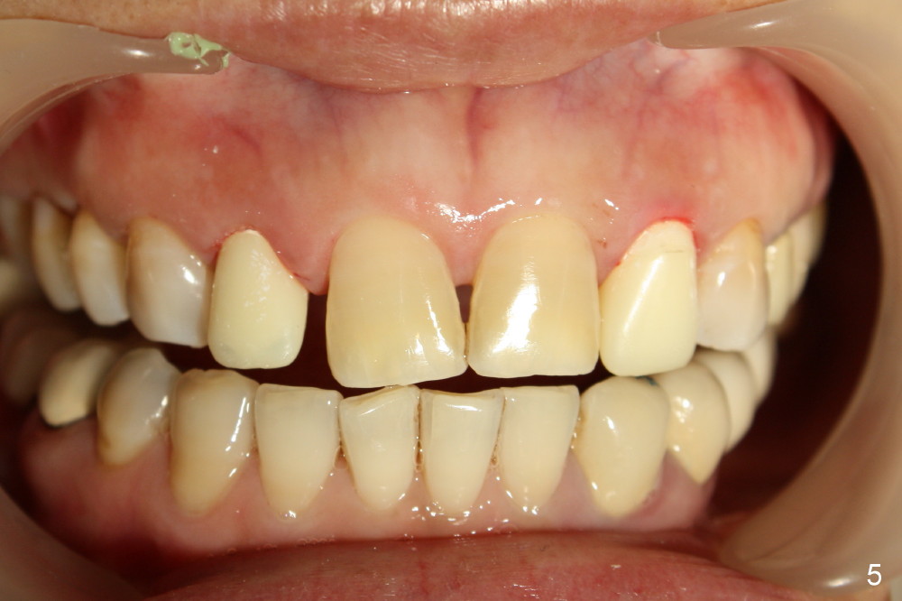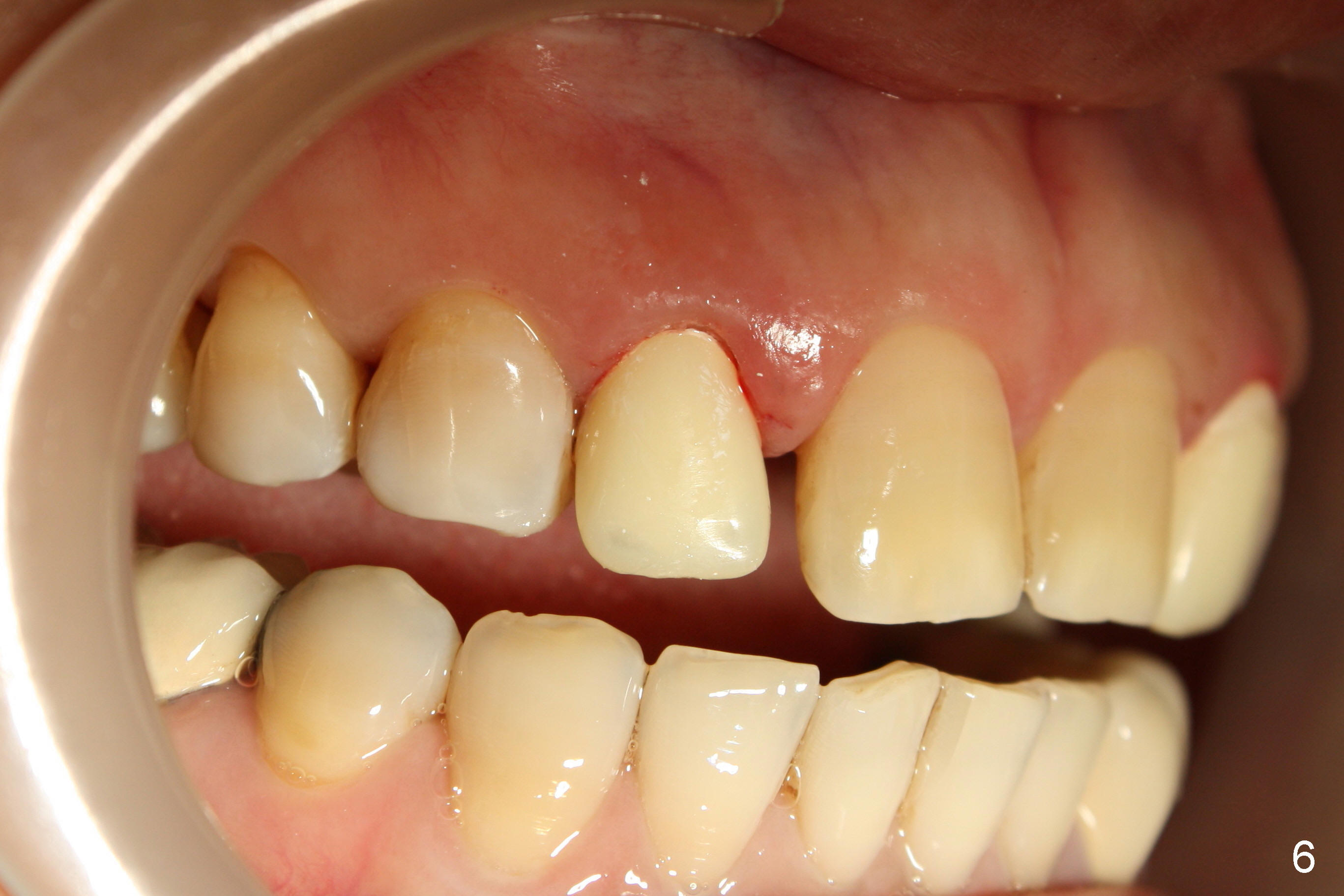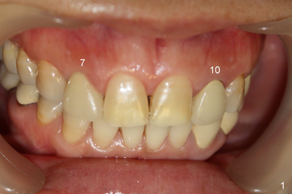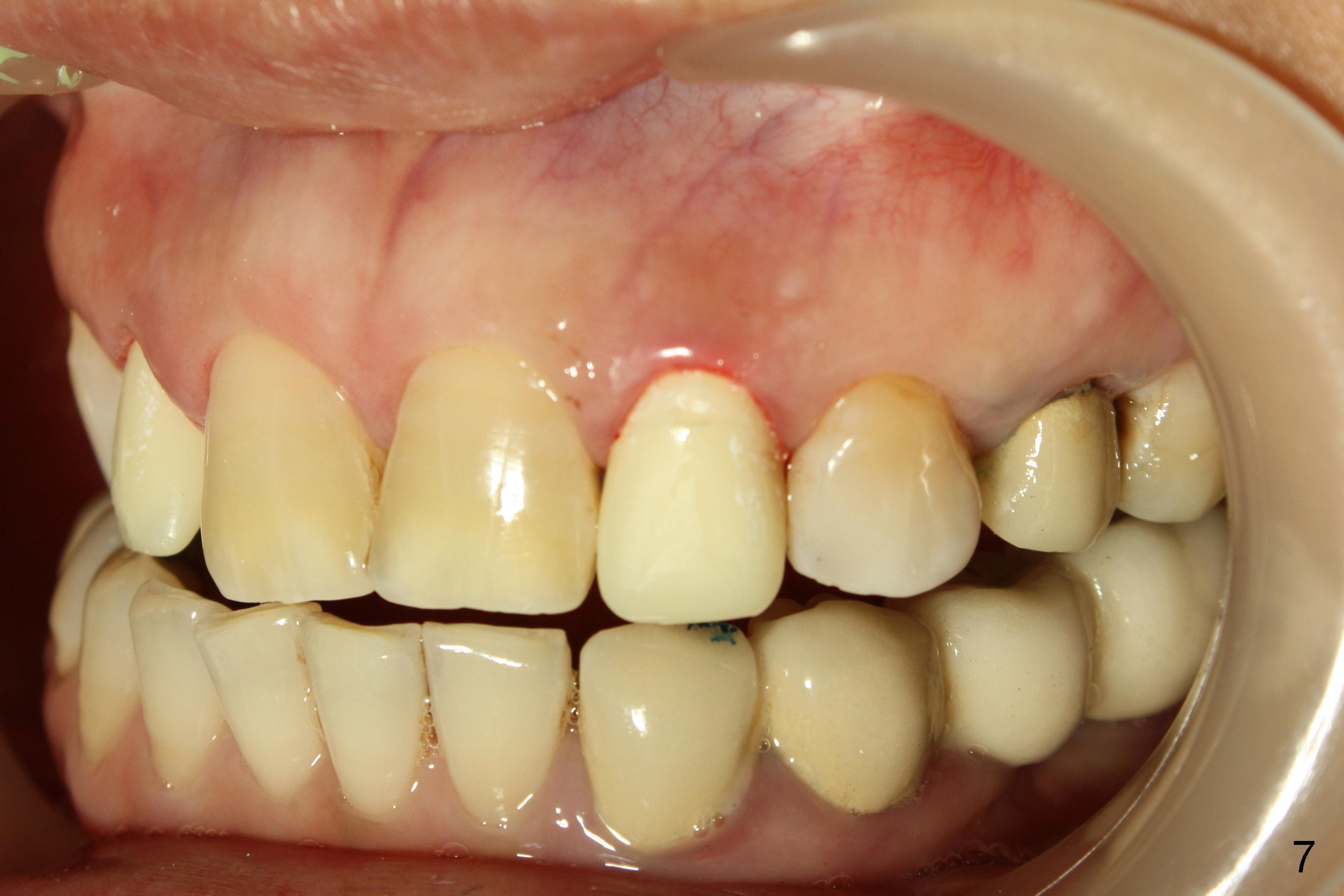 不过事与愿违,临时牙冠颜色不佳(图五,六,七)。制作临时牙冠让我们意识到七号牙原来牙冠问题:由于近中乳头(图二:M)比远中(D)大,牙根(R)偏向远中,苗条牙冠(临时)势必靠近远中(图六)。当时病人没有什么意见,当最终牙冠试戴时(图八),病人要求空隙放在远中,我们就那样做(图九,Emax)。