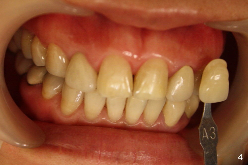 七八年前给陈太太装上七号牙陶瓷牙(PFM),她很快表示不满意(图一,二),我们再三表达歉意,可以重做。终于她愿意同时重做十号牙PFM牙冠(图三)。为了给她好的第一印象,重做前就开始选择牙冠颜色(shade, 图四),让临时牙冠颜色尽量接近正常 。我们有现成临时牙冠外壳(只有一种颜色),而acrylic powder(粉)有六种颜色(Bosworth)。