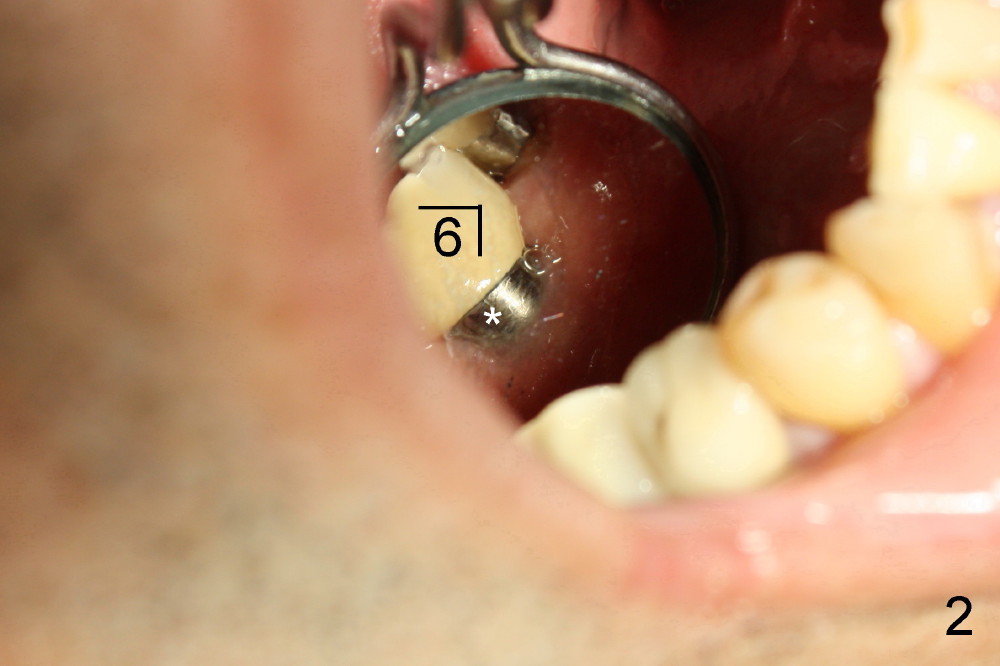 一两年前吴先生右下第一磨牙植牙偏舌侧(图一颊侧观,*:颊侧牙槽骨凹陷;图二镜影观,*:舌侧暴露植牙(光滑部分),但是他非常满意,他的论点是我们应该趁年轻,换所有该换的器官(包括牙齿)!