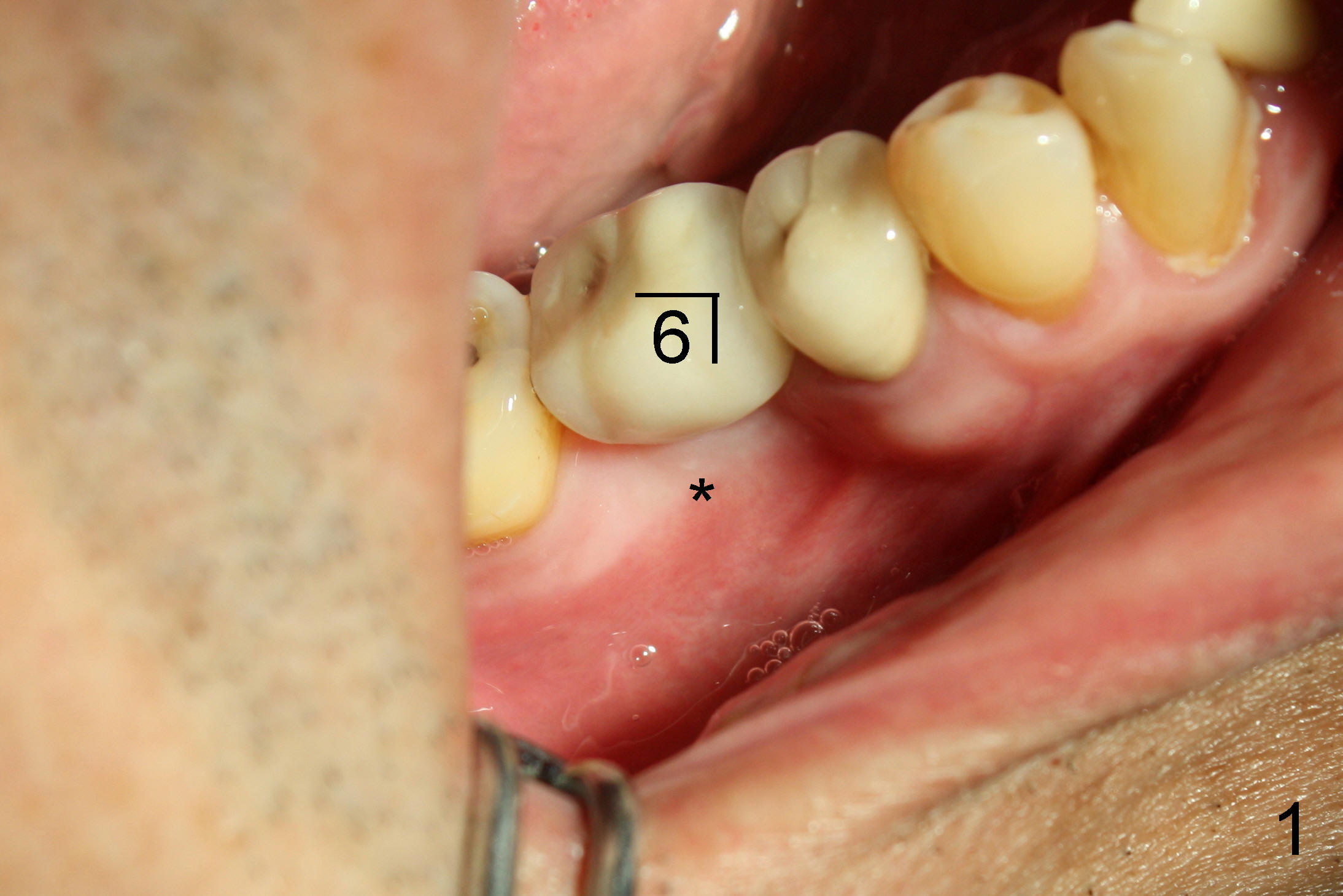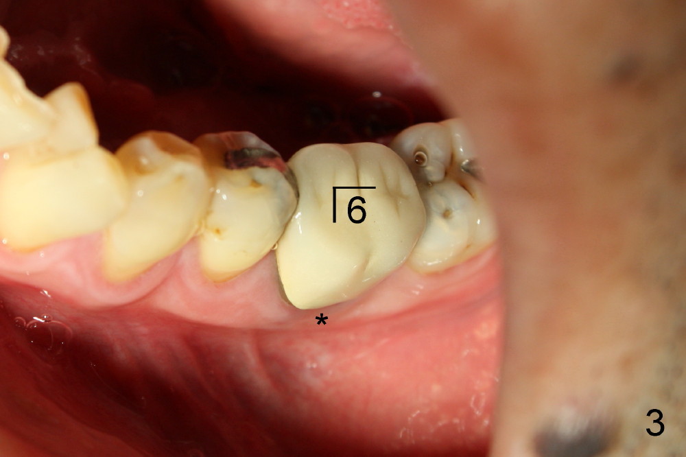 检查证实左下六颊侧骨板没有萎缩(图三,与图一对比),是立刻植牙适应症。不过根分叉牙龈没有红肿,探诊没有触痛,问病人疼痛性质,“刺痛”,再次仔细检查左下象限(图三),发现一个问题。那是什么呢?