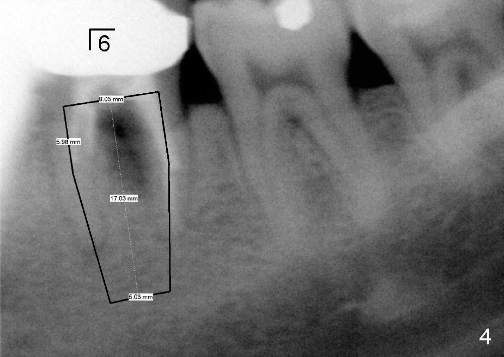 接电话同时研究他现有的X光片(图四,图形不清楚),那是五年前拍摄的,显示左下第一磨牙根分叉阴影,根管治疗不全,那颗牙齿确死无疑,同意他来诊所拔牙,即刻植牙(图四方块:植牙设计)。临时召集两位助手上班。