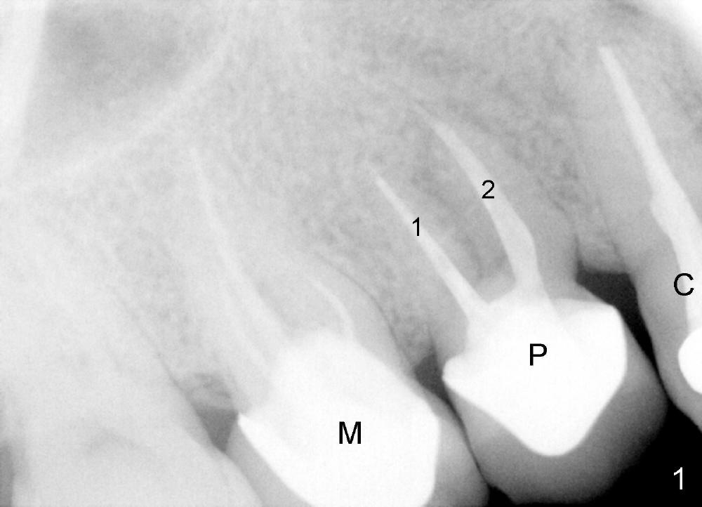 A 45-year-old man has multiple restorations. There is persistent pain in the upper right premolar (Fig.1 P, between canine (C) and the 1st molar (M)). This preop PA is taken several years before symptoms develop. It shows that this premolar is malpositioned: two roots (1,2) are aligned mesiodistally. The distal periodontal pockets are deep, consistent with root fracture.