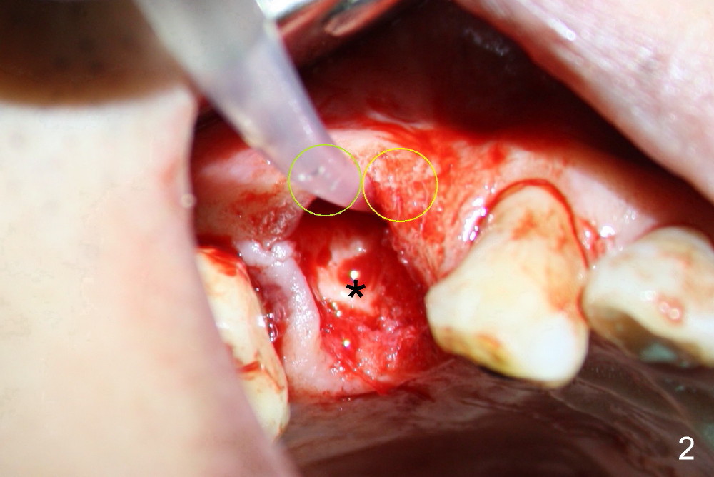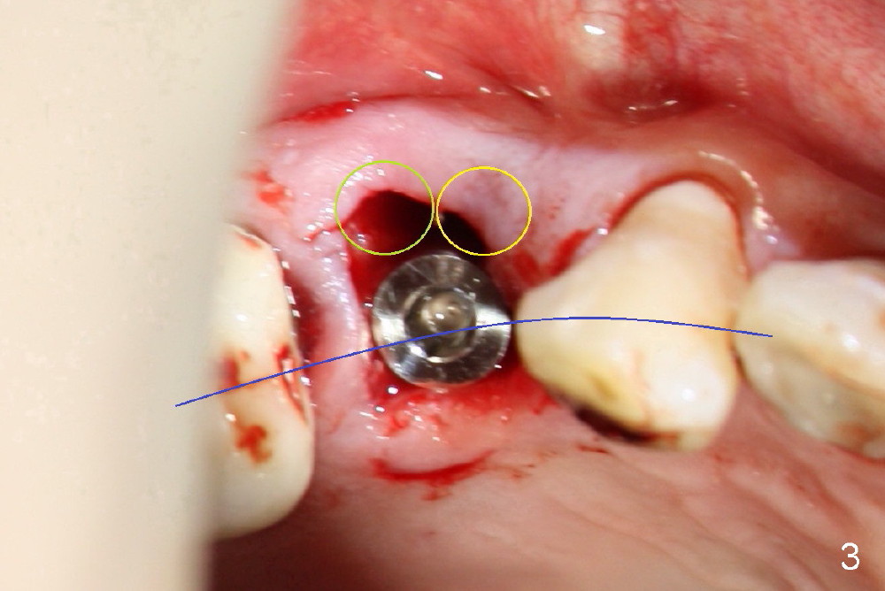 When the tooth is extracted, the two sockets (Fig.2 yellow circles, where the irrigation syringe is) are found to be buccally located, creating cantilever effect and probably leading to restoration failure/root fracture. There is bone palatal to the sockets (*). Bicon reamers are used to form osteotomy and collect autogenous bone at the same time (because of 50 RPM). A 5x17mm implant is placed, in alignment with arch form (Fig.3 blue curved line). The future restoration will be along the long axis of occlusion. Therefore the immediate implant achieves "instant orthodontic result".
