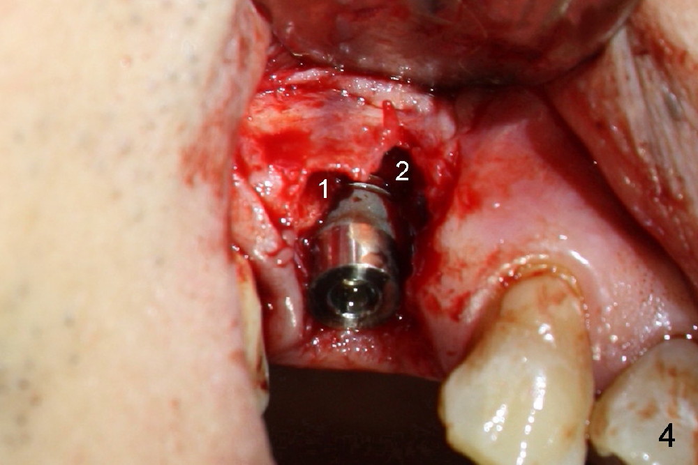 Buccal flap is raised (Fig.4) for bone graft and collagen membrane. The graft is autogenous, harvested using the reamers mentioned above and mixed with Bicon Synthograft.