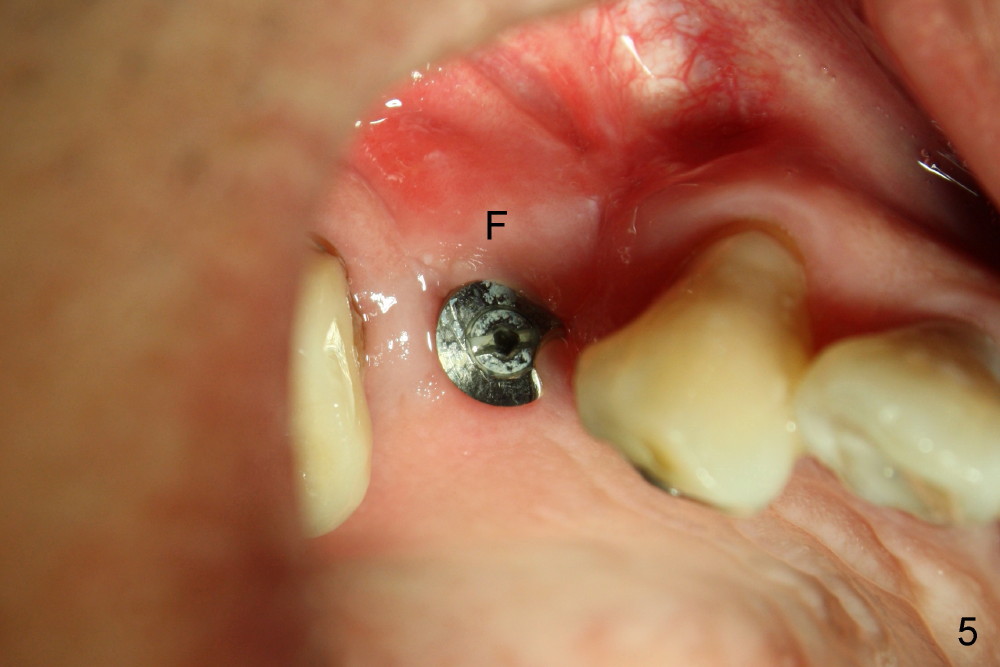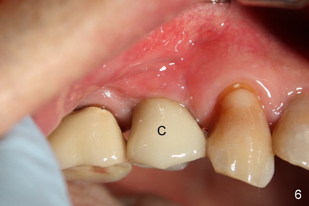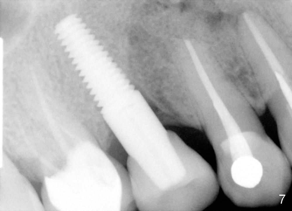 A single crown is cemented 3 months postop (Fig.6 C). Fig.7 is taken 6 months post cementation.