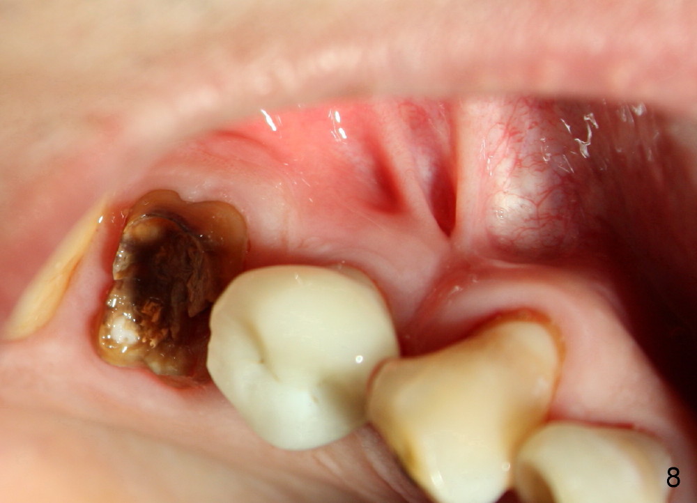 Eleven months post cementation, the patient returns for #3 crown recementation. The buccal plate atrophy over the implant is minimal (Fig.8).