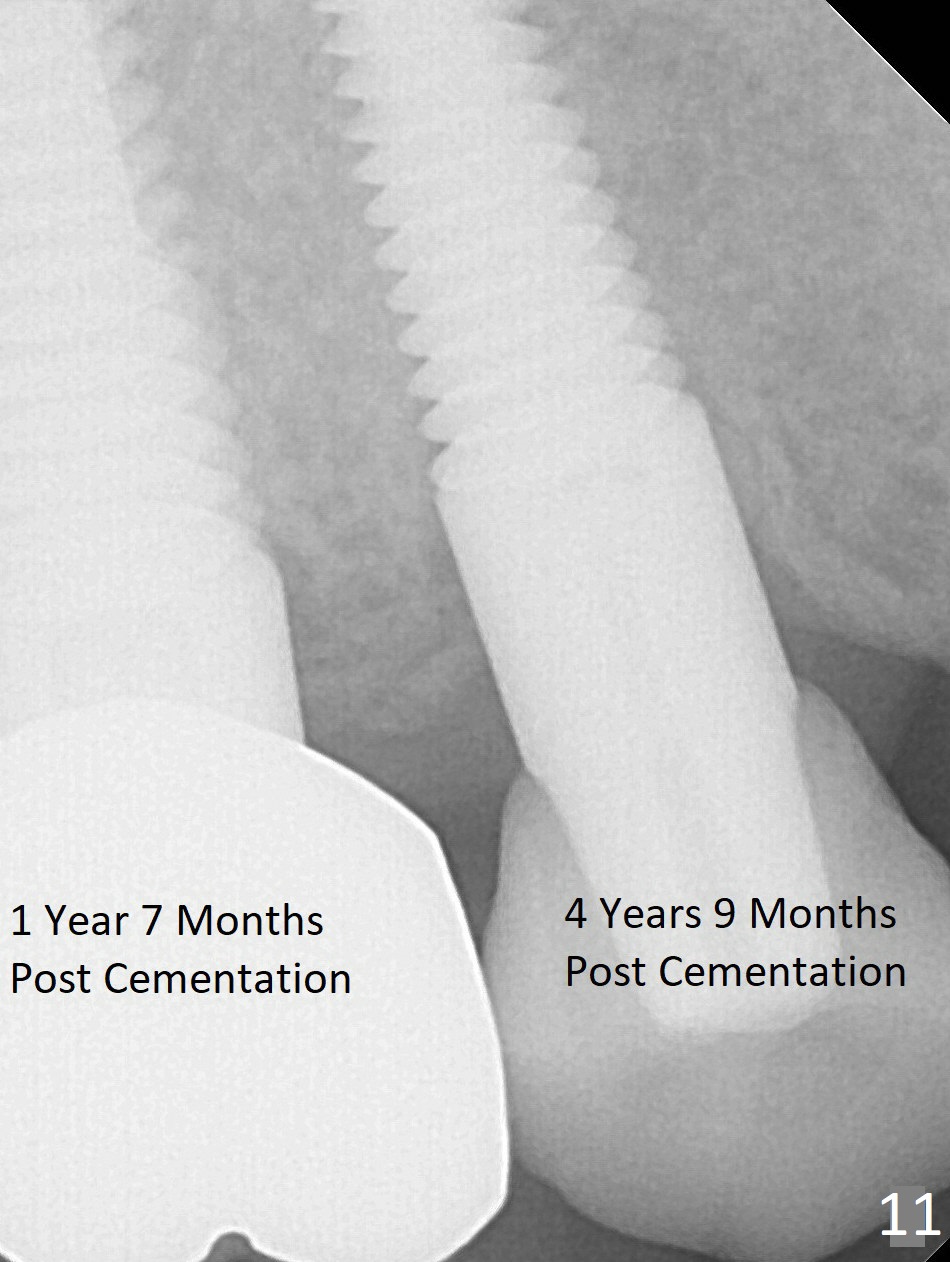 There is lamina dura-like structure mesially 4 years 9 months post cementation (Fig.11).