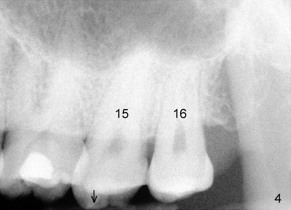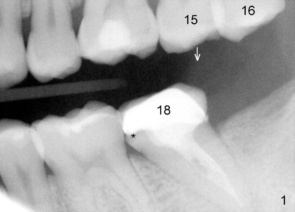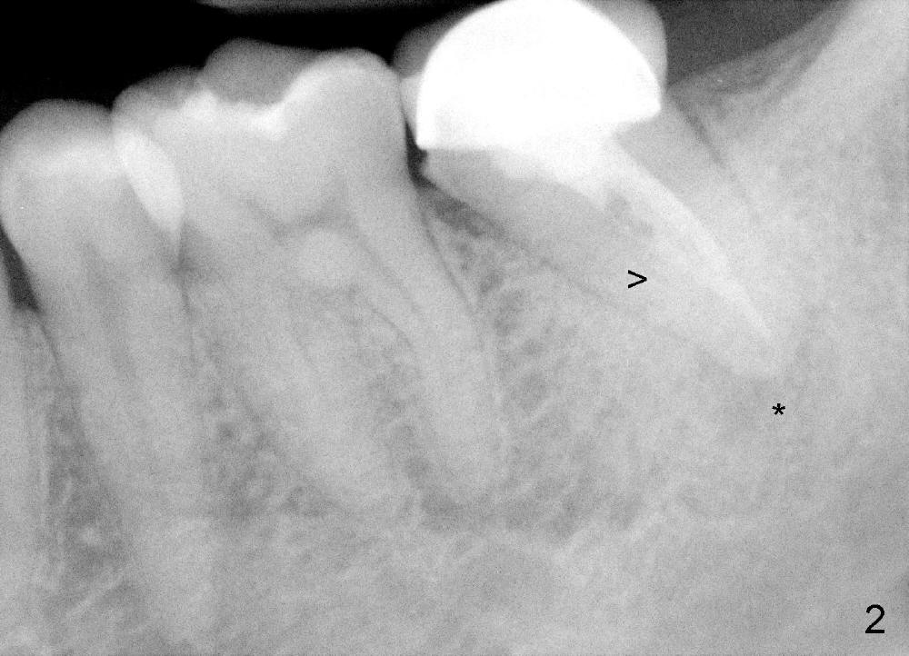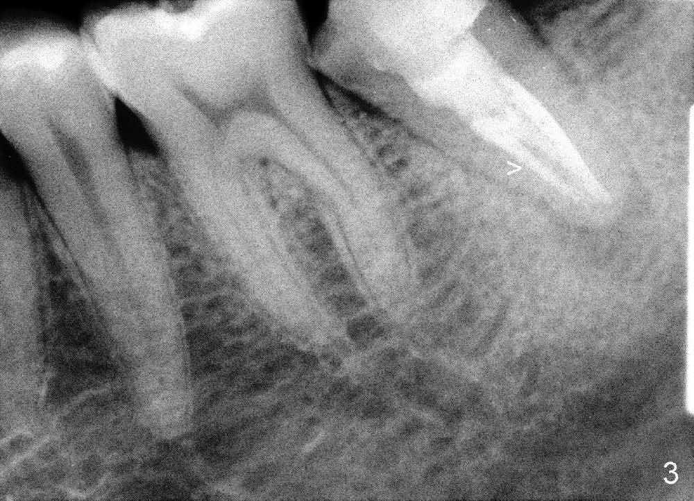 冷先生四五年前来诊所诊治,左下第二磨牙(图一:18)做过根管治疗,牙冠,偶尔不适,近中牙冠不密和(*,open margin),估计迟早会脱落,到时再重做根管治疗(retreat)好像为此不晚,病人听了这个方案没意见。三年半过去了,一切如旧,左下第二磨牙根尖阴影仍存在(图二*),仿佛一个根管没充填(箭头),病人同意拔除左上智齿(图一,四:16)。又过半年左下牙冠终于脱落,病人自动要求重做根管治疗,没充填根管找到,充填(图三箭头),之后症状消失,他很高兴。