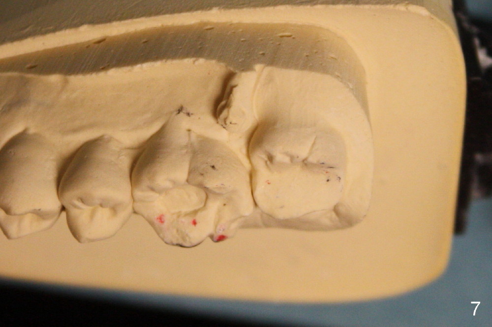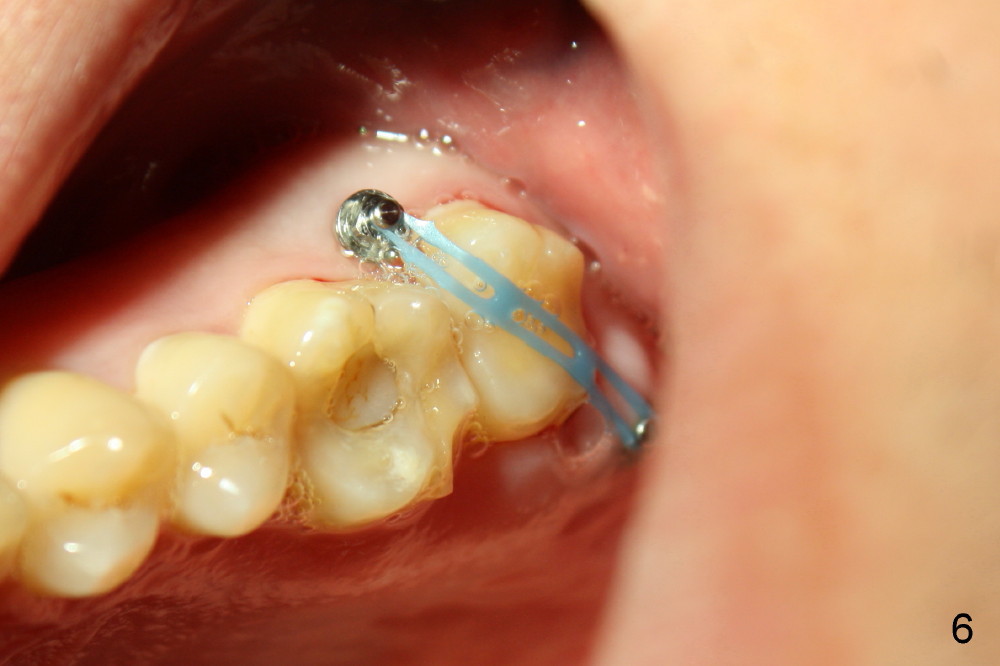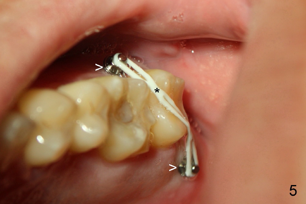 为什么那个牙冠会脱落呢?本来第二磨牙垂直高度就不足,另外似乎对合牙(图一,:15)向下面伸长(箭头),占据下牙空间,牙冠高度不够,最好方法便是使用微型植牙(图五箭头)和橡皮筋(*),持续对对合牙施加压力,它慢慢地往上移动(intrusion)。刚四十岁的冷先生对新鲜事物容易接受,正好他的保险还保这项治疗(局部矫正)。两个月后,牙齿移位不少(图六),总共四个月我们目的达到了(开始做牙冠):其实矫枉过正(图七),正是我们期待,不过告诉实验室做牙冠时不必使用所有间隙,让对合牙自己下降。