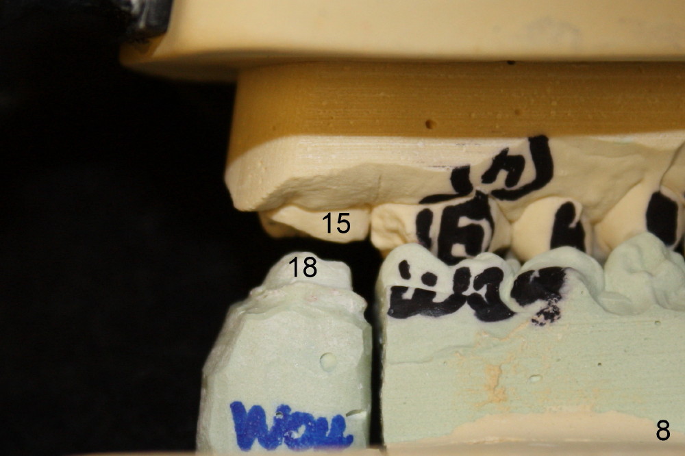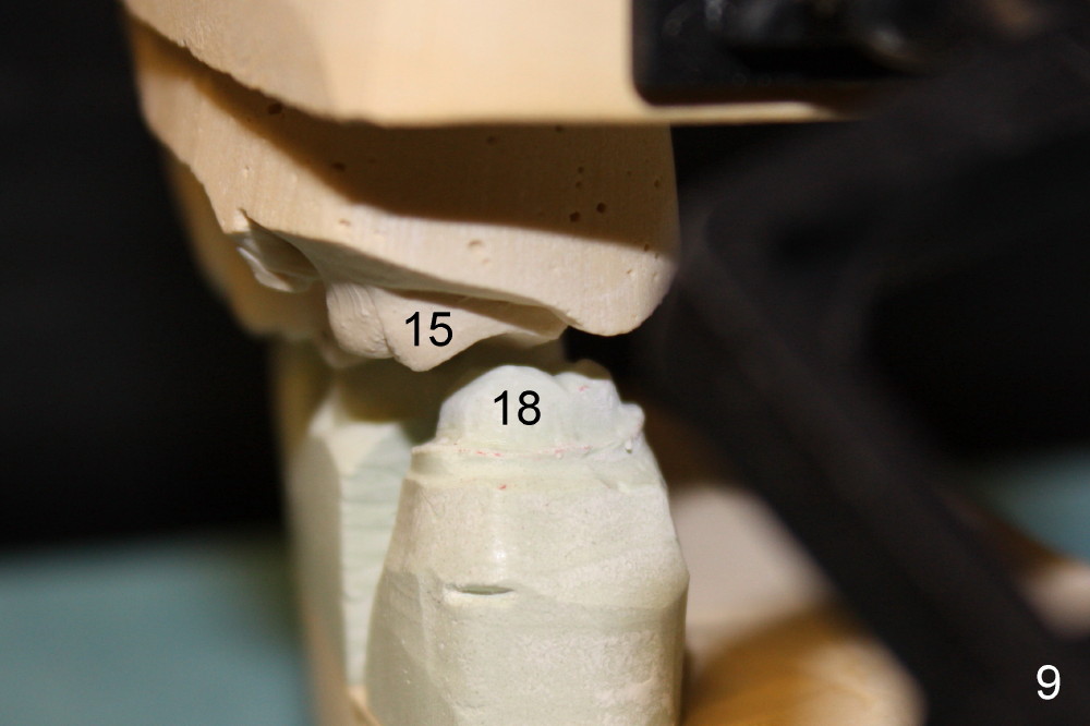 有趣的是临时牙冠脱落几天后,病人才回来重新粘固,那时对合牙已经下降,我们不得不再次使用橡皮筋。粘固永久性牙冠时,上下牙齿没有接触,我们双方一点不担忧,不久后咬合会自行调整。图八显示模型舌侧,远中,上下第二磨牙(15, 18)之间有足够间隙做牙冠。一个月后,病人回来洗牙,他已经适应咬合,我们才撤除微型植牙。