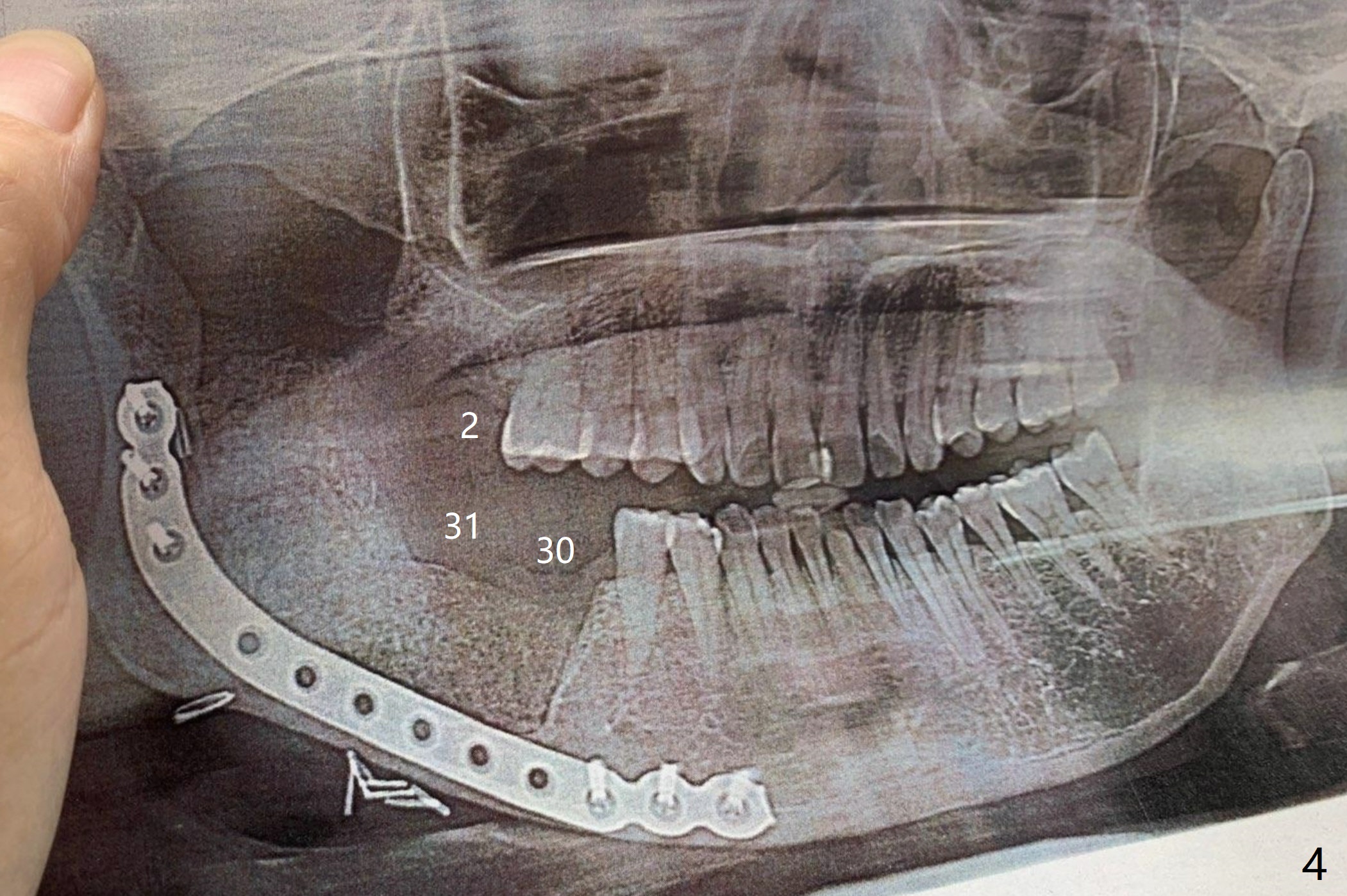 术前CT显示舌侧骨板吸收(图三)。术后全景片显示三个磨牙拔除,髂骨植骨,钢板固定(图四)。
