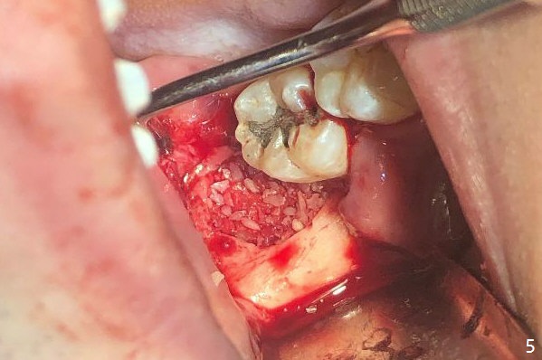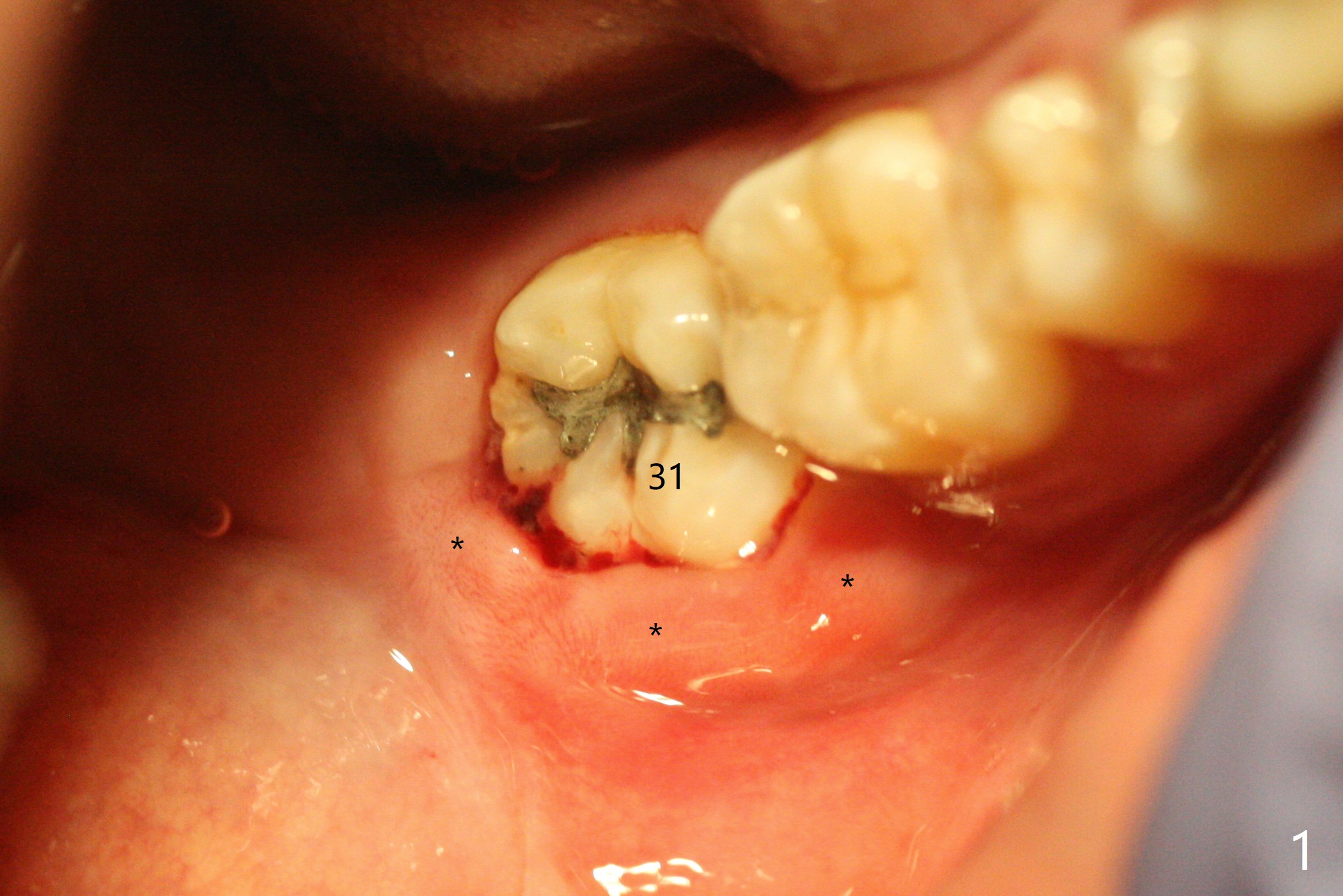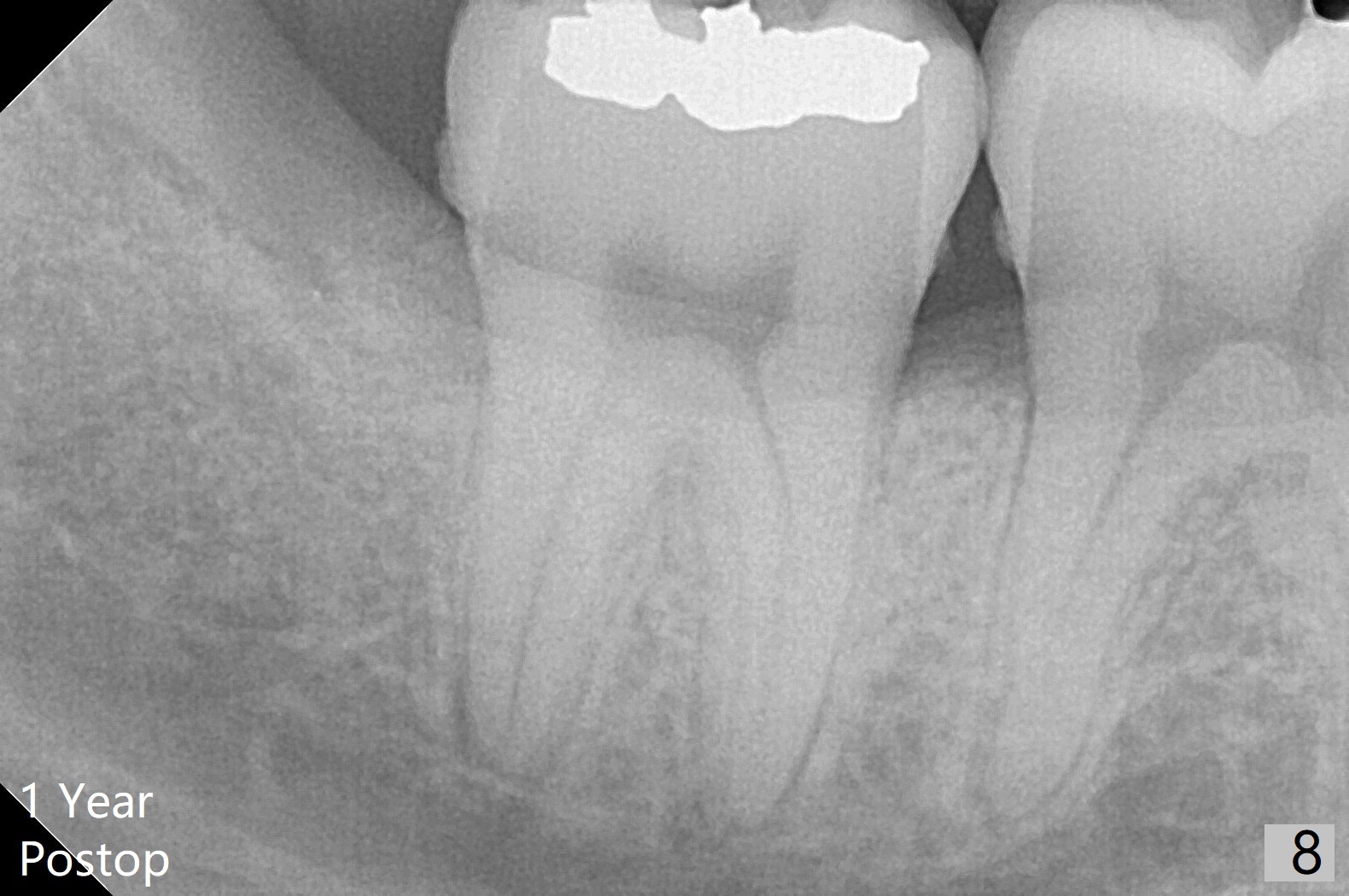 A 22-year-old man with poor oral hygiene requests extraction of the lower right 3rd molar. The buccal gingiva of the 2nd molar is erythematous and edematous (Fig.1 *). There is tenderness between #31 and 32 with severe bone loss (Fig.2 *). After extraction and debridement (Fig.3), Osteogen plug is inserted into radicular portion of the socket (Fig.4 white outline), while allograft is placed coronally (Fig.5, 7), covered by Collagen plug (Fig.6) before suturing. The bone fills the whole socket 1 year postop (Fig.8); there is no root surface exposure at #31. The bone fills the whole socket of #32 one year postop (Fig.8); there is no root surface exposure at #31.