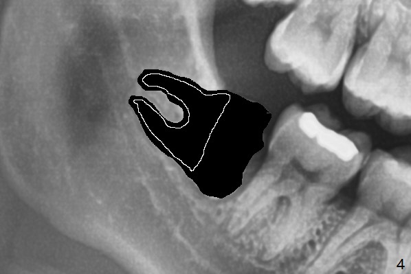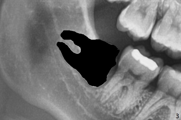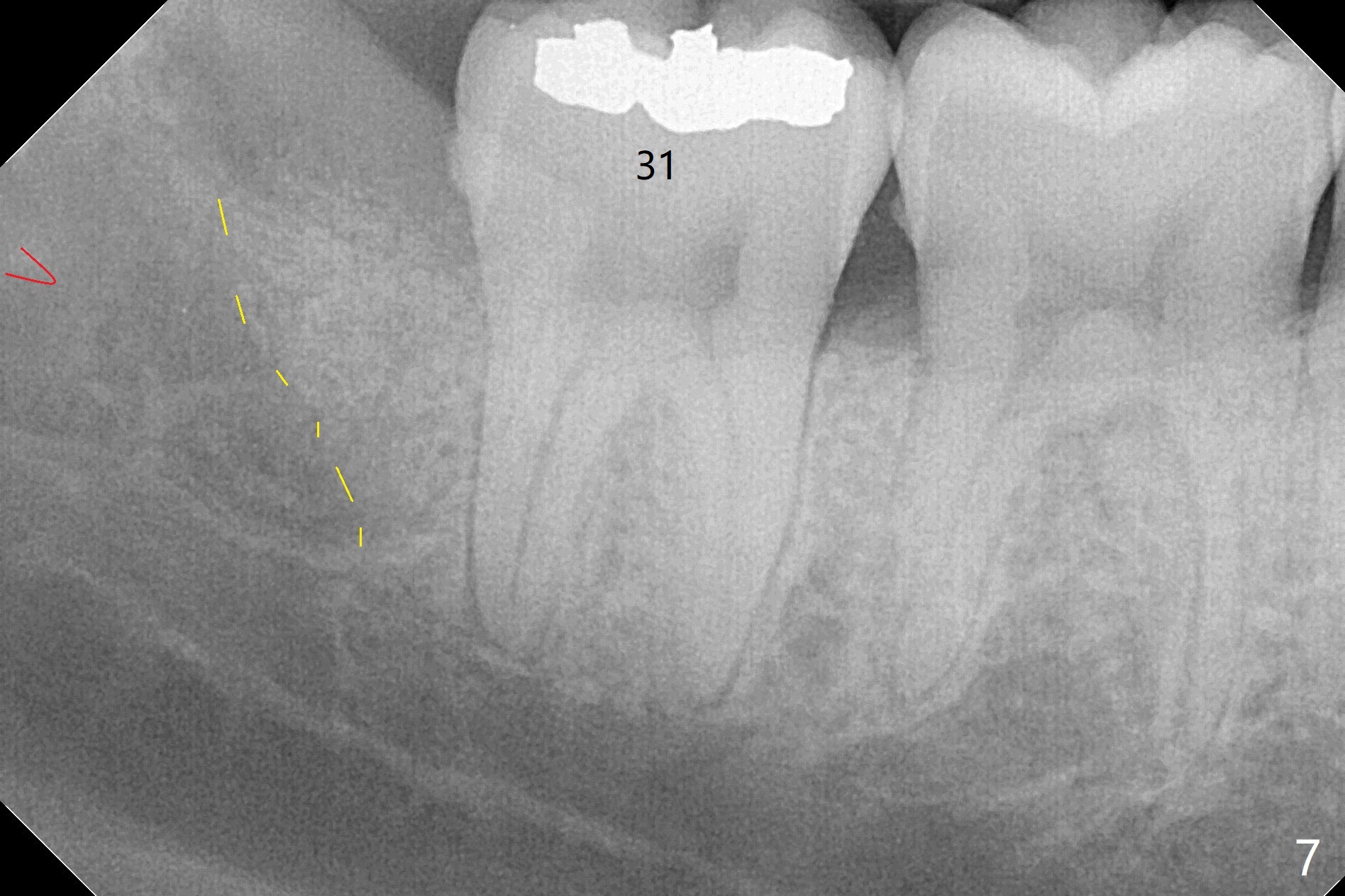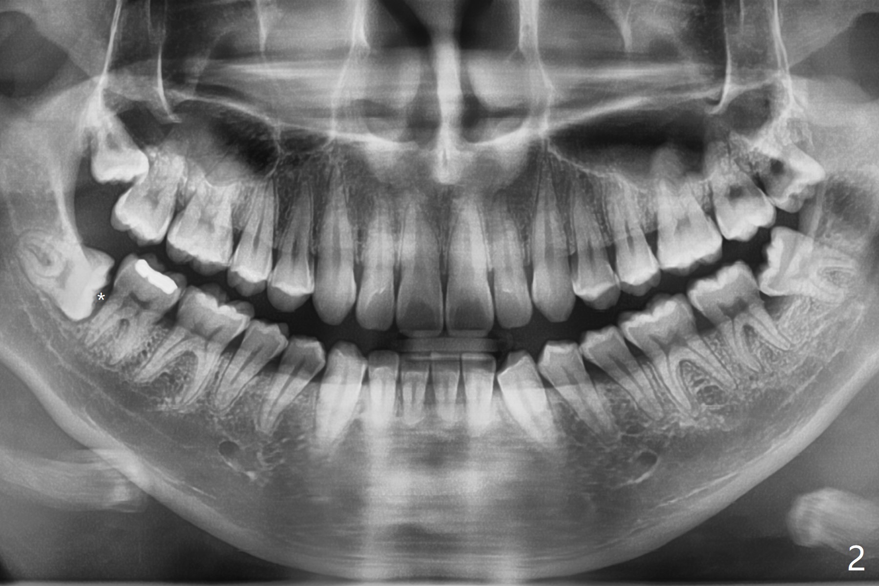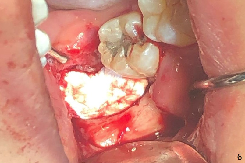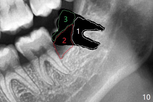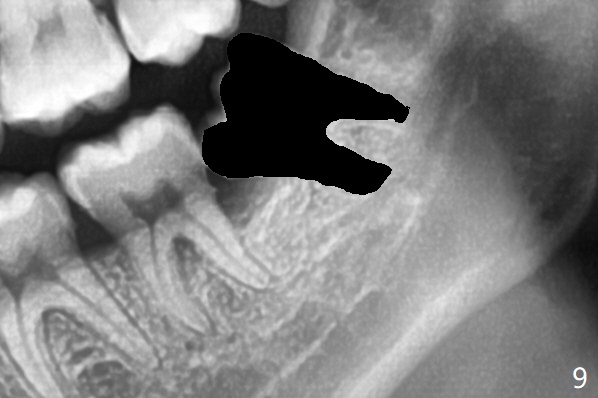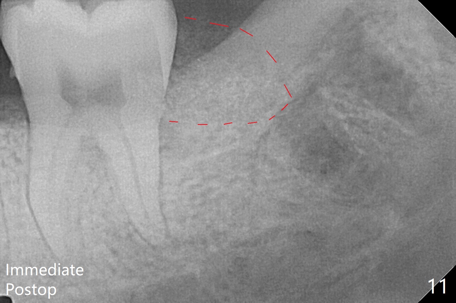 When the tooth #17 is extracted (Fig.9; 23 years old), collagen plug is inserted into the root portion of the sockets (Fig.10: 1 (white outline)), Vanilla graft is placed against the distal surface of #18 (2 (red outline)) and Osteogen plug (3 (green outline)) is placed coronally (3 steps). There is no bony defect associated with the distal surface of the tooth #18 immediate postop (Fig.11 (red dashed line: bone graft)). The wound heals in 2 weeks.