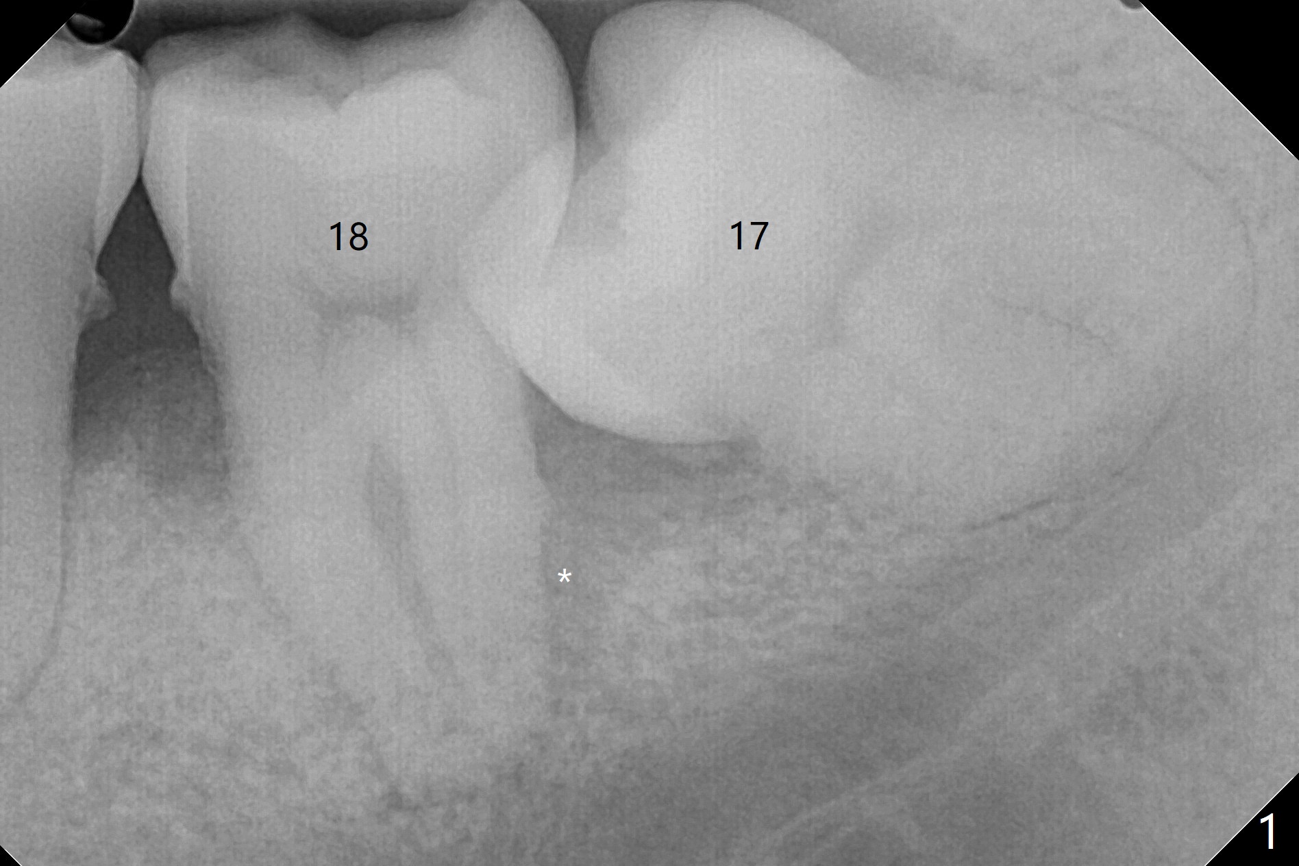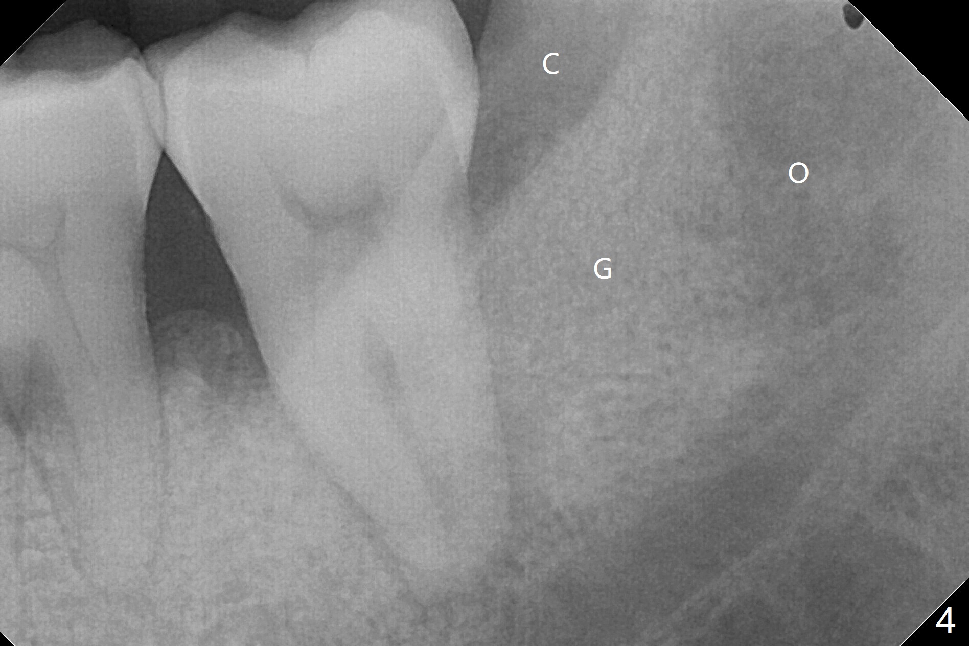 54岁男,吸烟,血糖略微升高,牙周炎,左下智齿疼痛,要求拔除(图一)。由于18号牙近中也有骨质吸收,预后不佳,所以拔除智齿后准备放置胶原塞,防止干槽症。左侧深洗后,发现智齿位于第二磨牙颊侧远中(图二),所以在第二磨牙近中做斜行切口(图三),万一伤口裂开,骨粉流失不会太多。智齿拔除后,发现第二磨牙骨质吸收严重,觉得植骨必要,但是没有时间制备PRF。使用GEM21S与皮质骨骨粉调袢。由于缺损巨大,17号牙牙槽窝远中塞入骨胶原塞(图四:O (Osteogen Plug)),18远中和颊侧放置骨粉(G),骨粉上面放置胶原塞(相当膜的作用),然后缝合。