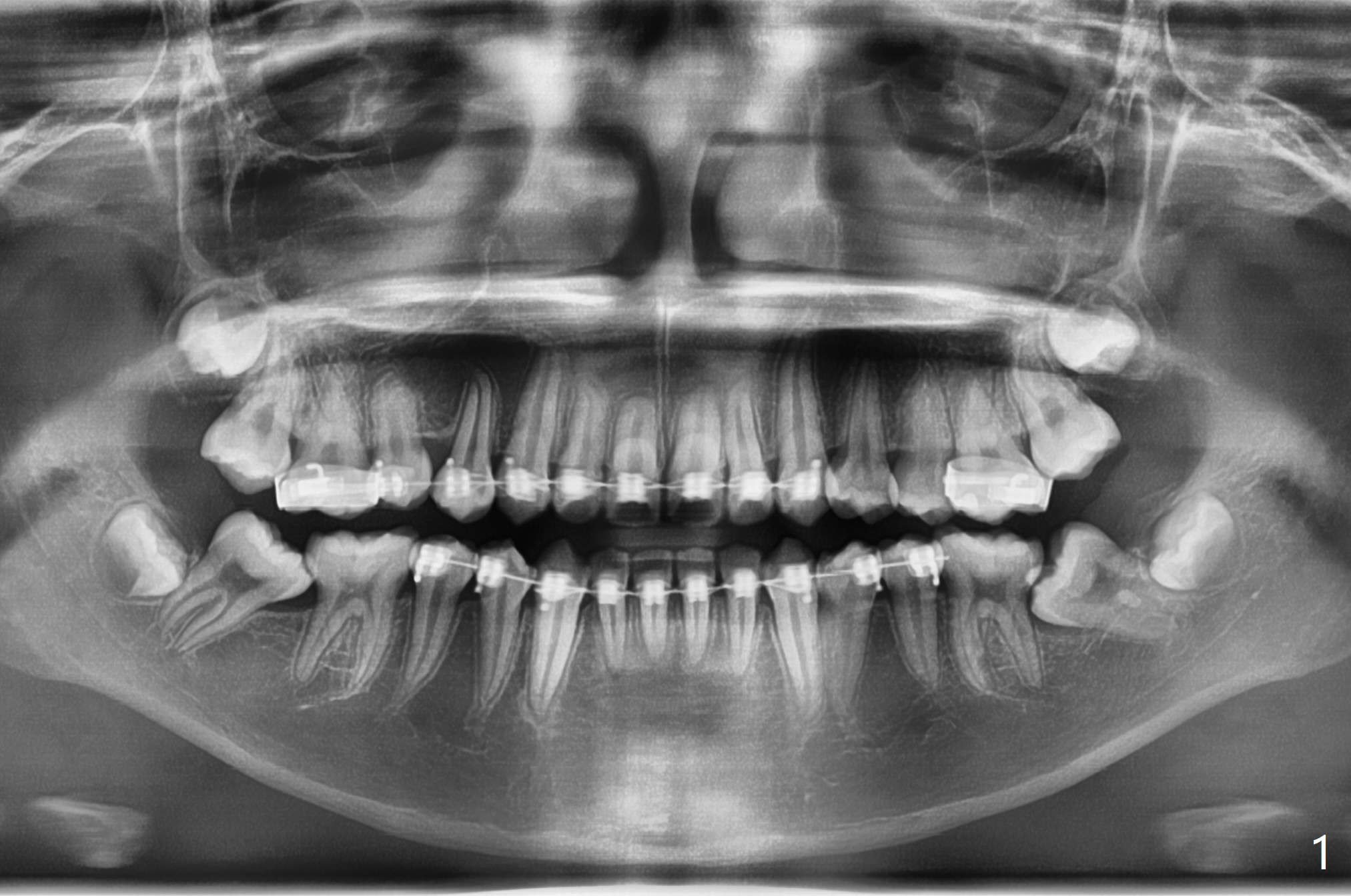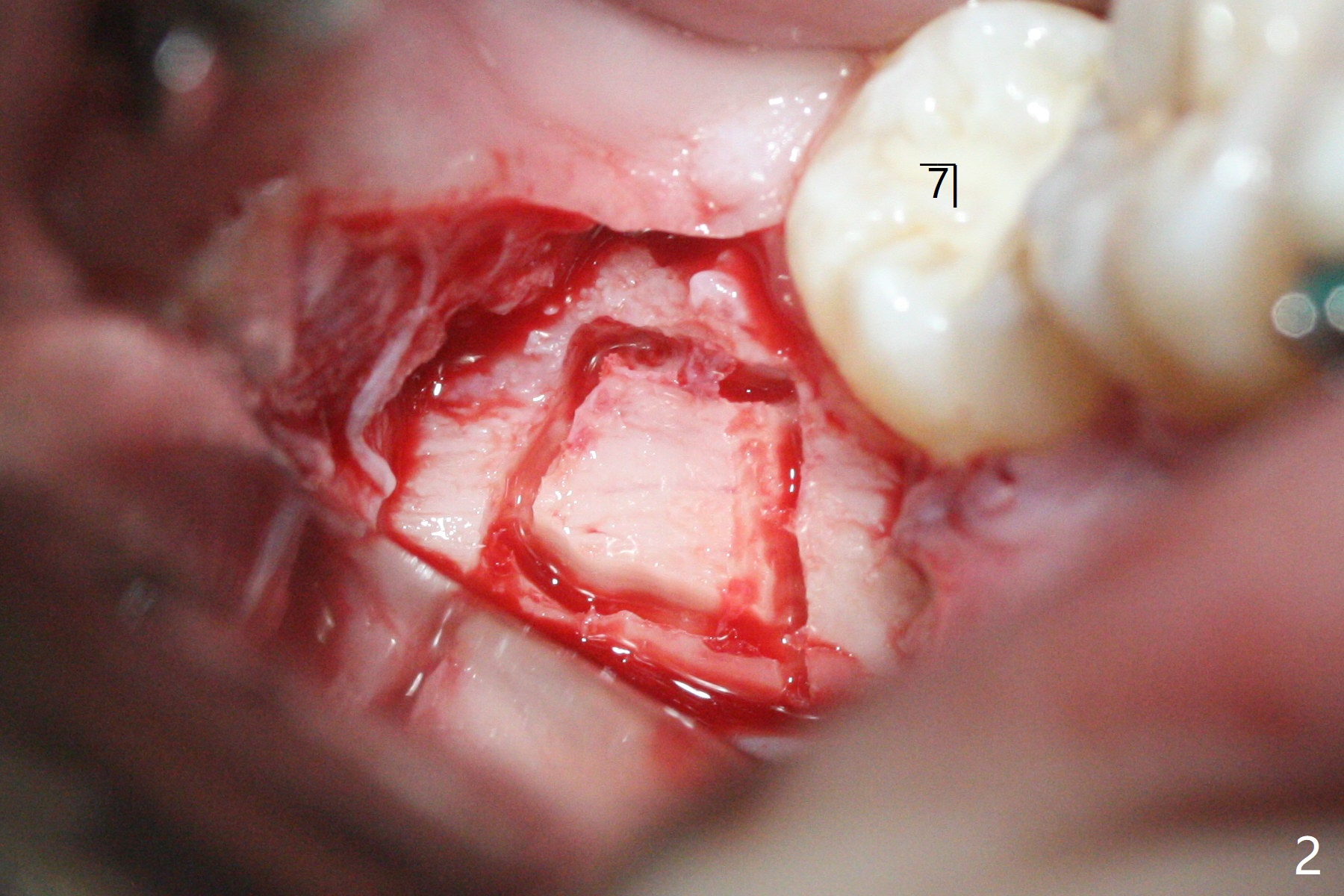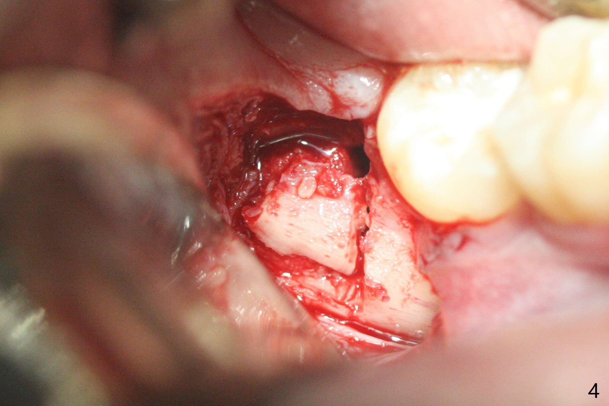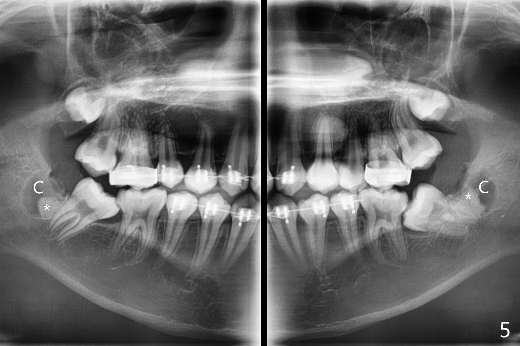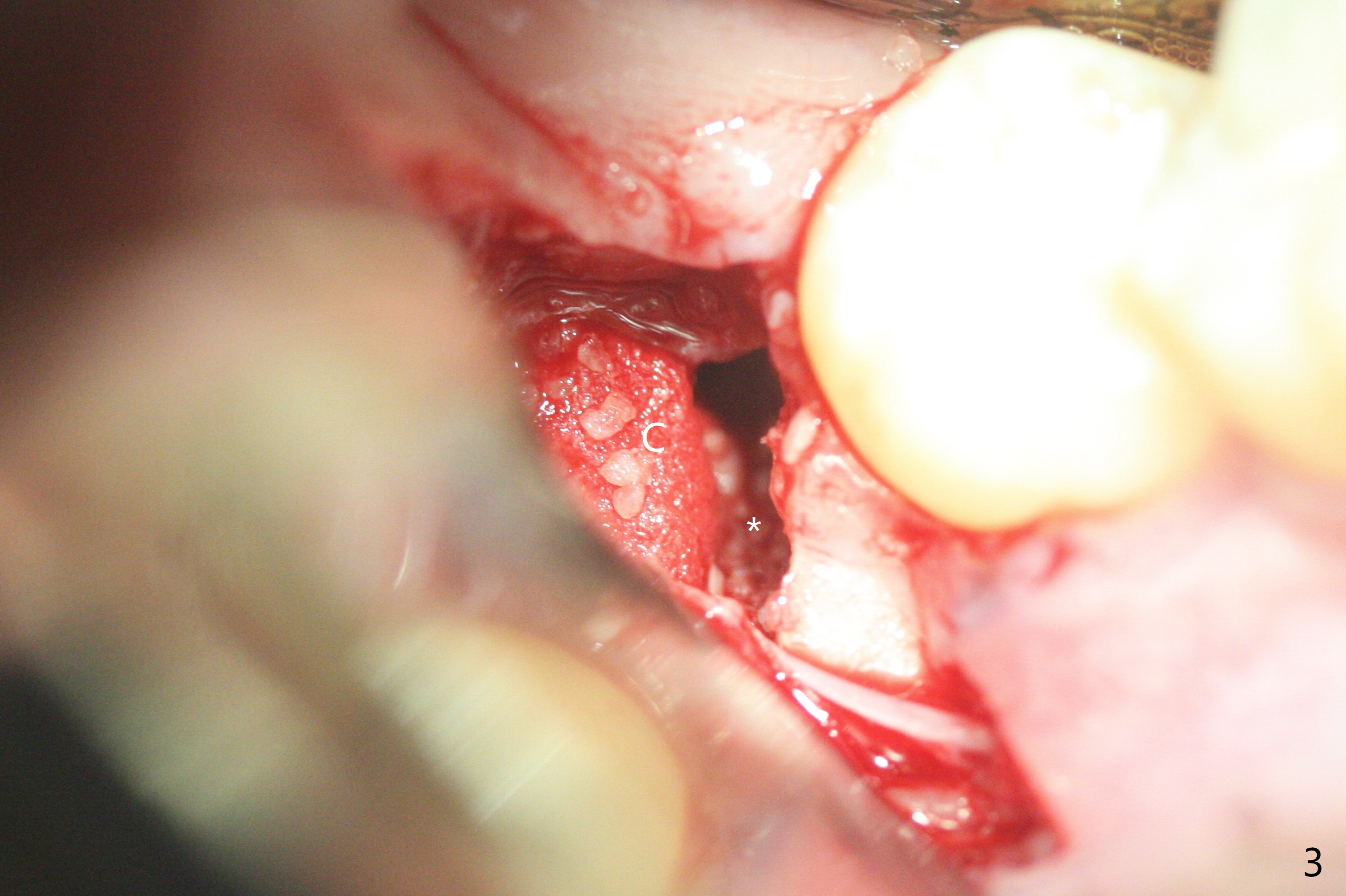 13岁男在矫正医生诊所矫正三年(上中切牙牙根短,图一),转来拔除下颌智齿以助于第二磨牙upright。左侧先拔除,切除三个小块颊侧骨板,保留其中一个与异体骨一起植入牙槽窝近中部分。右侧拔除时,索性切除一个大块颊侧骨板(图二),智齿拔除后,近中牙槽窝放置异体骨(皮质,图三,五:*),远中胶原塞(C),放回颊侧骨板(图四)。Return to Plug Xin Wei, DDS, PhD, MS 1st edition 11/03/2020, last revision 11/03/2020