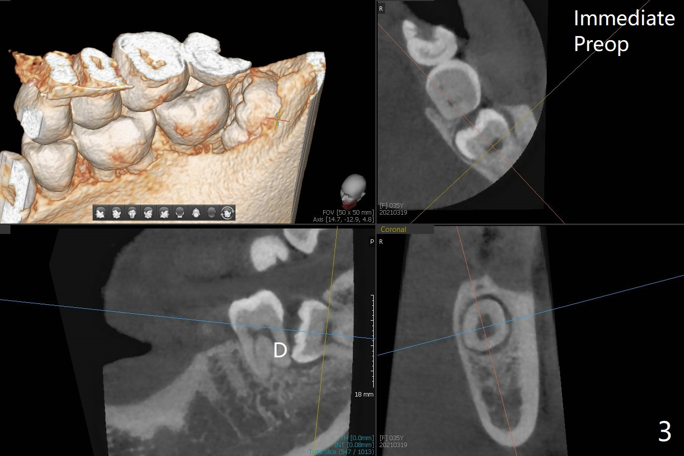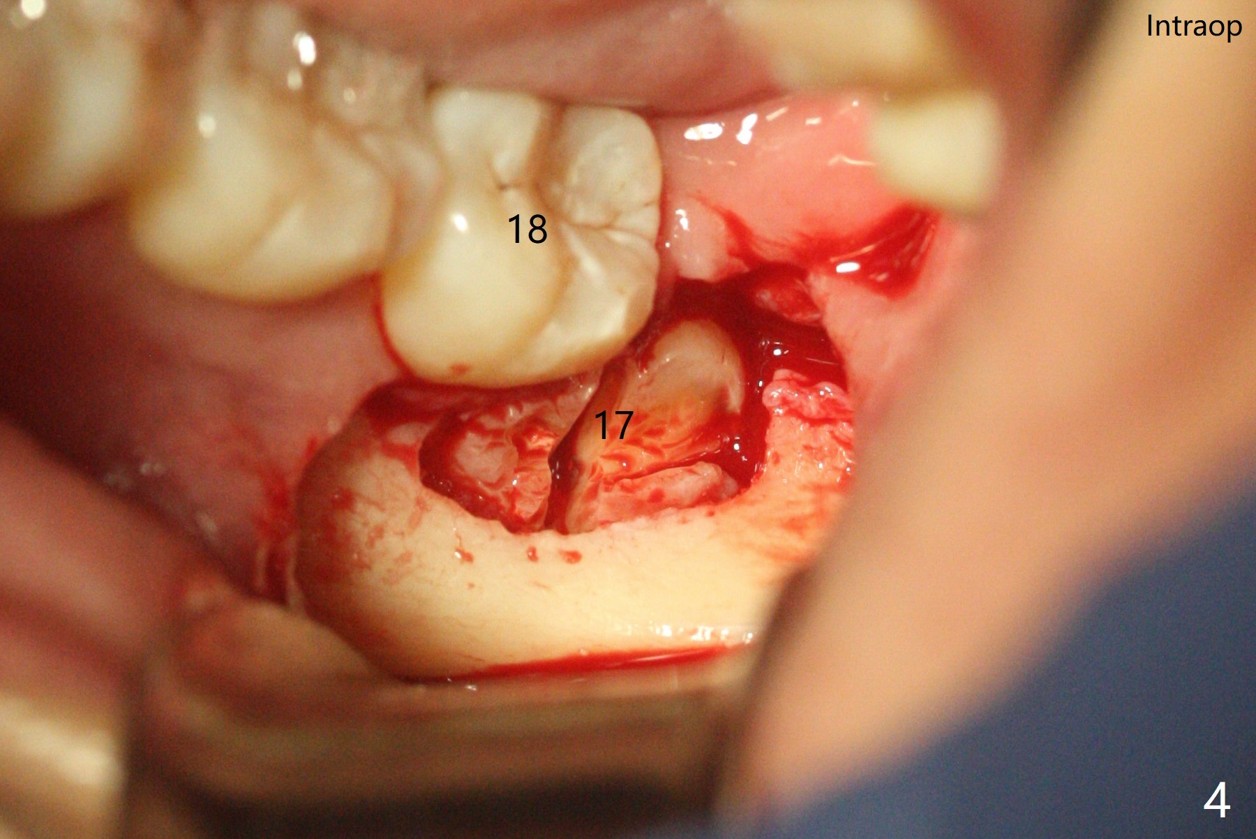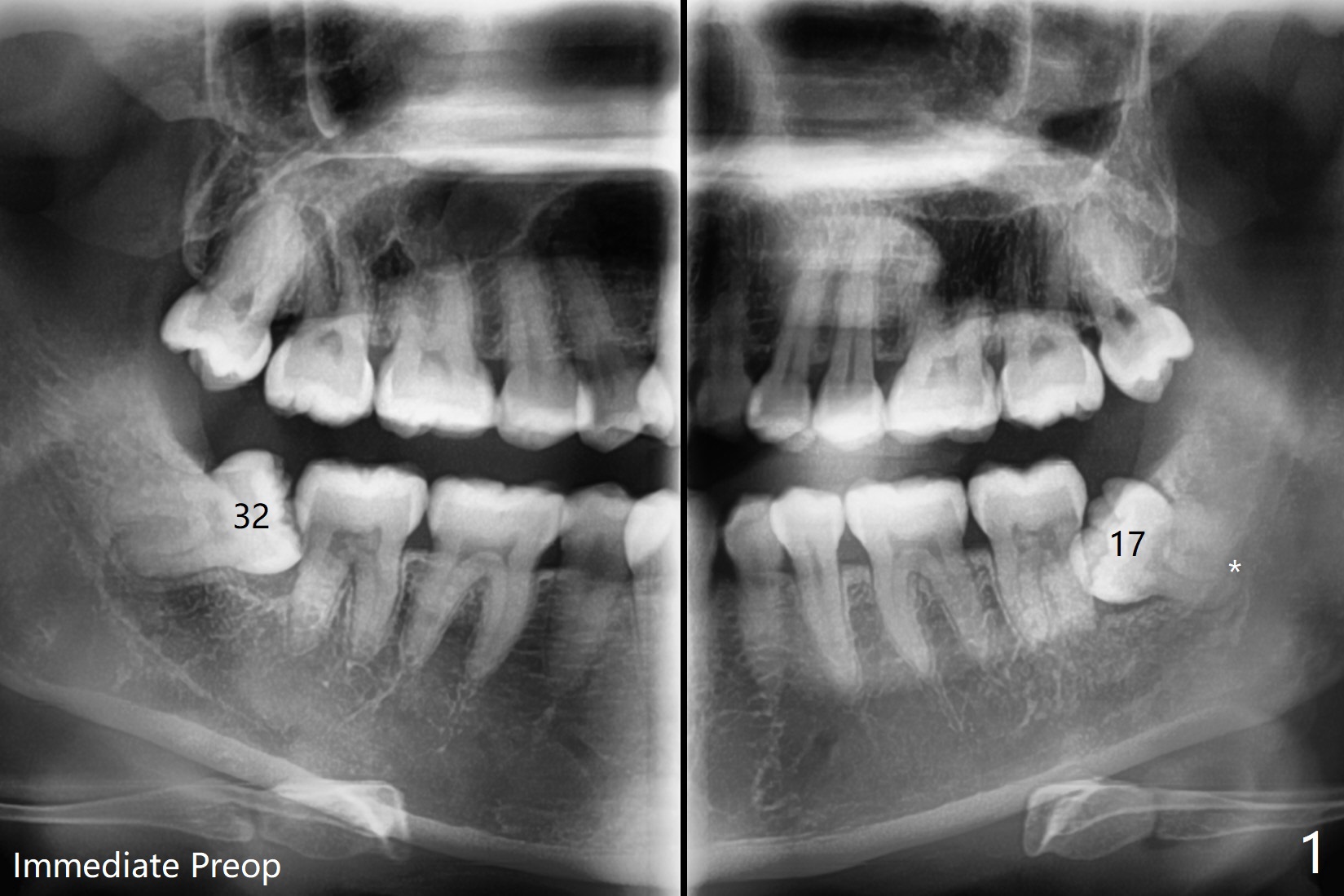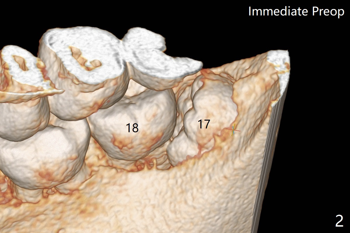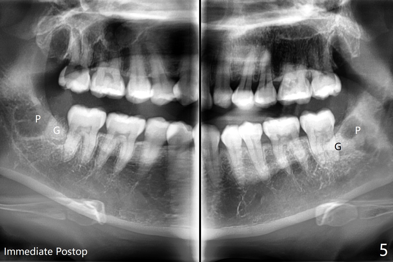 A 35-year-old timid woman finally decides to have 4 of the 3rd molars extracted (Fig.1). The apices of #17 overlaps with the Inferior Alveolar Canal (*). Small field CT shows that #17 is buccal to #18 (Fig.2), causing distal root exposure (Fig.3 D). In fact the buccal overlap seems to be more severe clinically (Fig.4) than what X-ray indicate (Fig.1,3). Therefore bone graft seems to be able to be packed mesially (Fig.5: G). In fact the left Inferior Alveolar Canal is exposed after extraction, collagen plug (P) is placed distal without use of curette around the exposed canal.