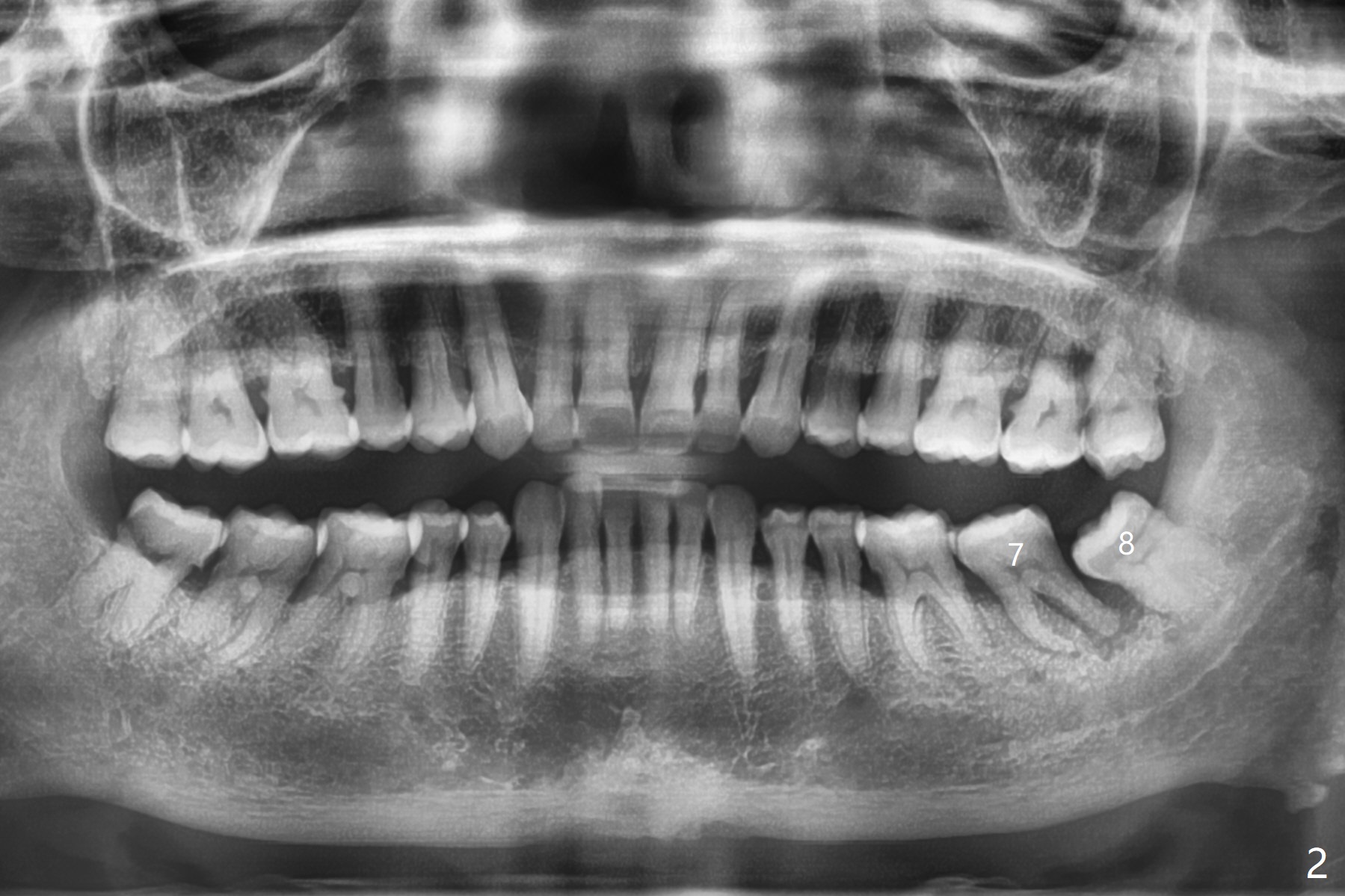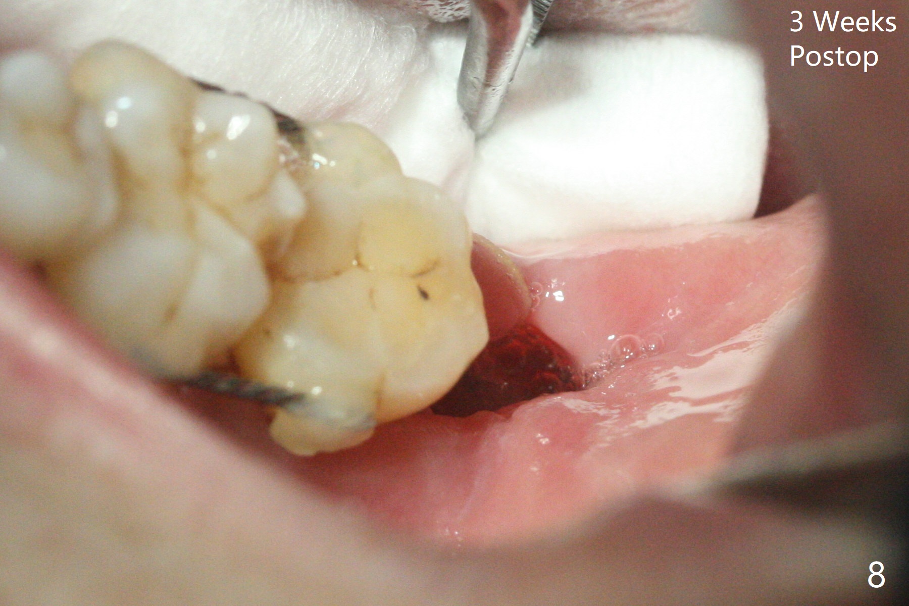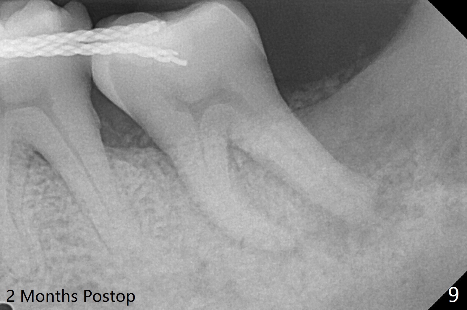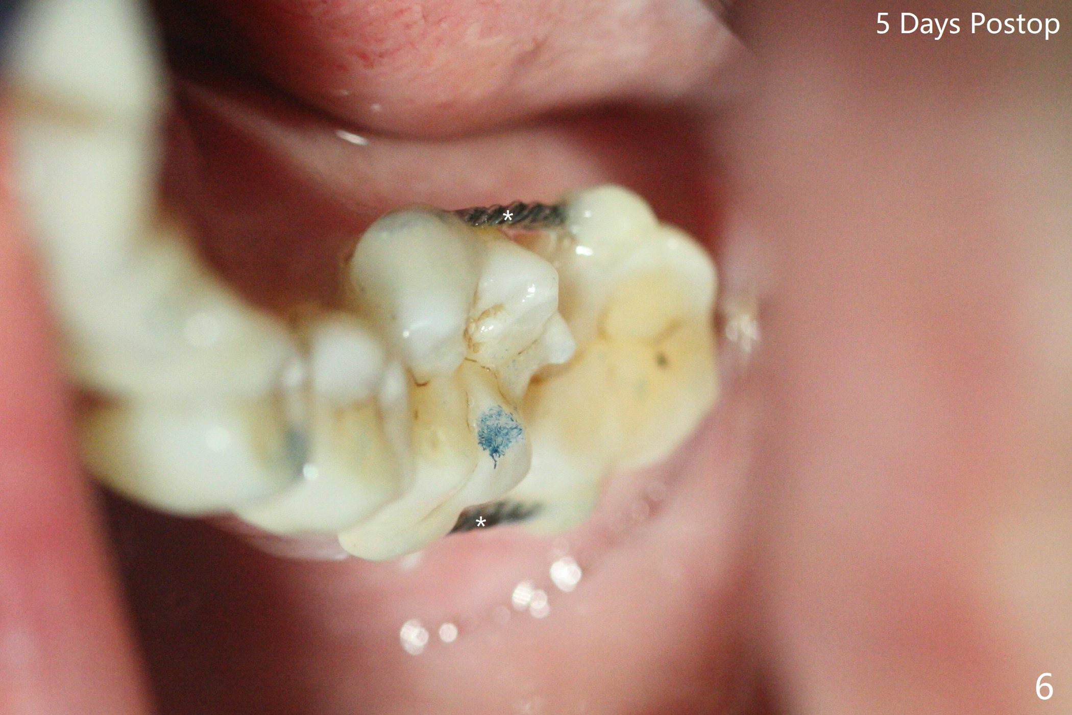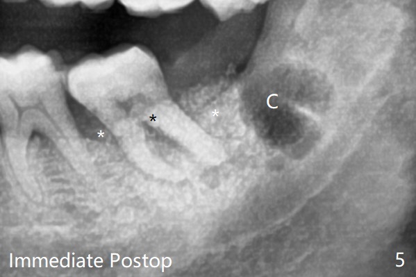 65岁女,南方人(广州),主诉左下肿胀,8舌侧粘膜穿孔(图一(舌侧观):<),初步问诊,回答:“全身没问题”,详细问诊:骨质疏松,静脉注射Reclast两年,准备拔除使用PRF修复缺损,全景片显示7远中骨质吸收严重(图二),因此8拔出后,牙槽窝塞入胶原塞(图五:C),将粘性骨粉放置7近中,远中(图五:白*)以及颊侧(黑*),把一片PRF膜覆盖骨粉(7颊侧,8牙槽窝口),另外一片放置于8舌侧穿孔(图四:箭头)颊侧,促进愈合,然后使用4-0 PGA缝合(图三(颊侧观),图四(舌侧观))。术后5天用钢丝(图六:*)和树脂固定松动牙,并且降低咬合。舌侧穿孔正在愈合(图七:>)。虽然术后三周智齿伤口裂开,但是没有症状,病人满意第二磨牙不再松动(图八),开始深洗。下次复诊拍摄根尖片观察骨质愈合。术后二个月第二磨牙远中没有骨质再生(图九),临床上远中牙根暴露。