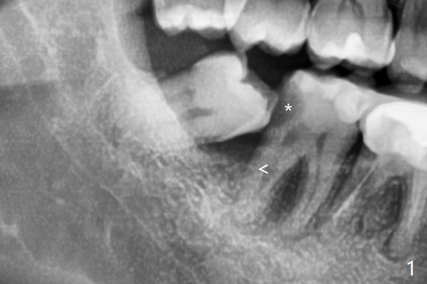 当57岁男因右下7龋齿夜间痛(图一:*),远中骨质吸收(<)就诊时,提出拔除8后放置粘性骨粉和PRF,他欣然同意。拔除智齿(没去骨,但是劈牙)后,7远中去龋,临时充填(图二:*(IRM,必要时转诊根管治疗))。为了让粘性骨粉在最关键部位(7远中)发挥作用,放置前在牙槽窝根尖放置胶原塞(C),占据空间,后来发现骨粉量足够。