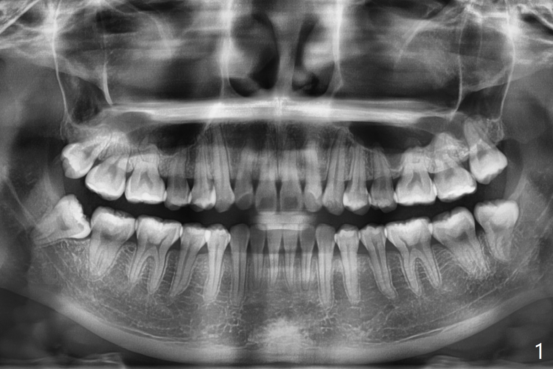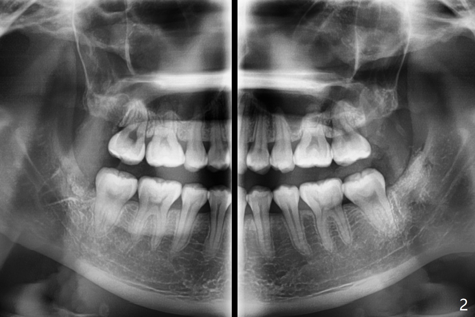 22岁女要求拔除4个智齿,右下接近下齿槽神经,必要时拍摄局部CT,如果牙根跨越神经,劈根取出,新拍摄全景片显示根尖与神经关系不是那么密切。牙槽窝底部放置底部沾有PRF液体的(结果没有这样做,因为抽血很少)Osteogen plug(一种胶原骨塞,结果放胶原塞1/2),牙槽窝近中,第二磨牙远中放置粘性骨粉,牙槽窝上部放置PRF膜(结果放胶原塞另外1/2,抽血困难),PGA缝线。左下牙槽窝放置沾有PRF液体(结果没有这样做,因为抽血很少)的胶原塞(第二磨牙远中没有缺损),覆盖PRF膜(很小一块,以及一半胶原塞),缝合。