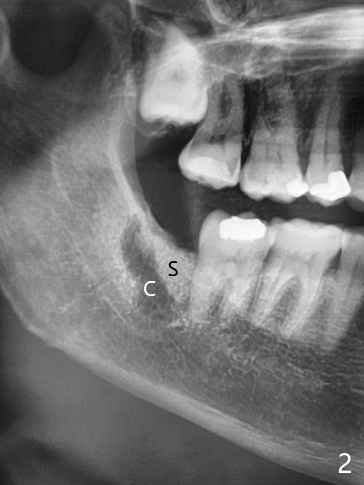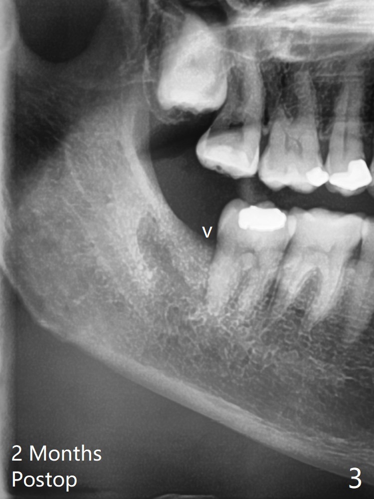 56岁女因右下智齿牙龈出血要求拔除,切开后发现智齿周围骨质吸收,有许多肉芽组织(图一:*),拔除容易,清创时远中牙龈出血,需要压迫止血,之后在牙槽窝远中,近中放置胶原塞(图二:C)和粘性骨粉(S),上面覆盖PRF,使用4-0 PGA缝线,近中伤口缝合不紧。术后两个月随访时拍摄全景片证实骨粉没有明显流失(病人抱怨术后骨粉流失,逐渐减少),第二磨牙远中没有骨板,第三磨牙近中牙槽嵴接近正常外形(图三:箭头)。Return to Plug Allograft 儿子 Xin Wei, DDS, PhD, MS 1st edition 06/07/2021, last revision 08/01/2021