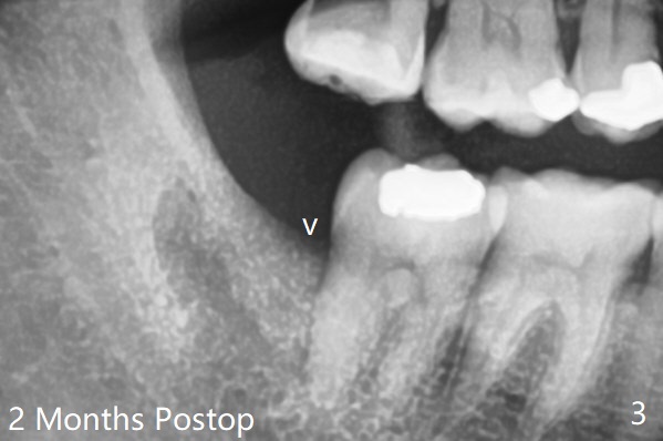 之后在牙槽窝远中,近中放置胶原塞(图二:C)和粘性骨粉(S),上面覆盖PRF,使用4-0 PGA缝线,近中伤口缝合不紧。术后两个月随访时拍摄全景片证实骨粉没有明显流失(病人抱怨术后骨粉流失,逐渐减少),第二磨牙远中没有骨板,第三磨牙近中牙槽嵴接近正常外形(图三:箭头)。