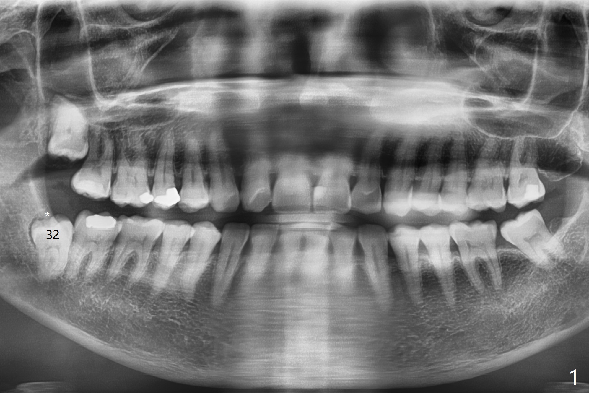 56岁女因右下智齿牙龈出血要求拔除,切开后发现智齿周围骨质吸收,有许多肉芽组织(图一:*),拔除容易,清创时远中牙龈出血,需要压迫止血,