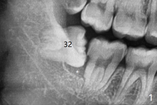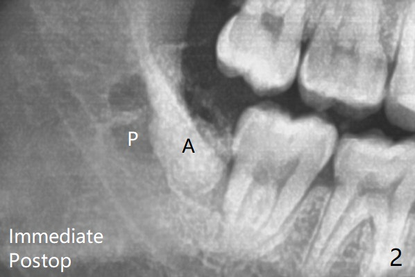 A 23-year-old man with poor oral hygiene presents to clinic with pain at #1 and 32. Because of bone loss between #31 and 32 (Fig.1 *), Bond Apatite (1 cc, Fig.2 A) is placed in the defect area following insertion of Collagen Plug in the sockets (P, a half). The other half of the Plug is placed coronal to Bond Apatite before suturing with 4-0 PGA.