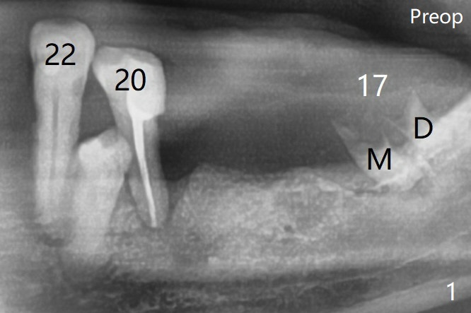 A 84-year-old man (uncontrolled diabetes) requests extraction of terminal teeth (#17, 20-22) for complete denture (Fig.1). The sockets seem to remain radiopaque 2 months postop (Fig.13).