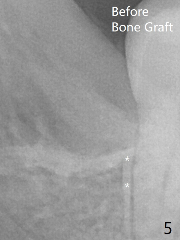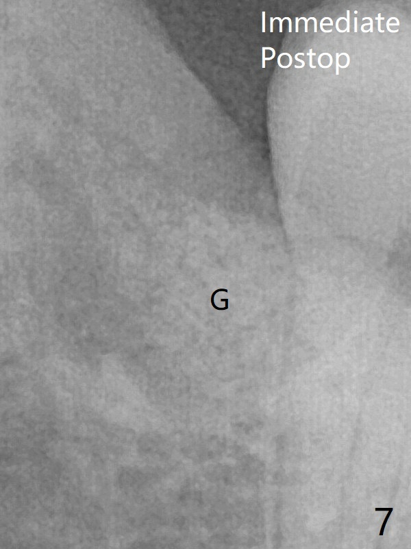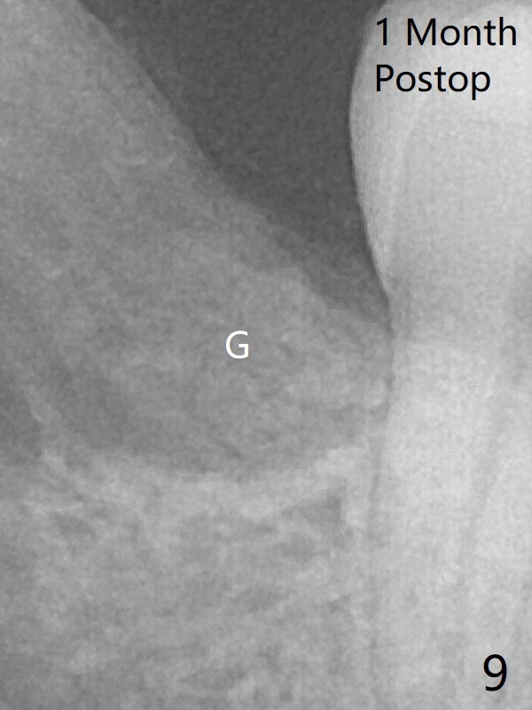 The transverse cortex connecting to the lamina dura (Fig.5 *) is obliterated when allograft is placed (Fig.7 G). The part of the graft remains in place 1 month postop (Fig.9) in spite of wound dehiscence (Fig.8). The bone graft loss is indicated by the fact of the reappearance of the transverse cortex (Fig.9).