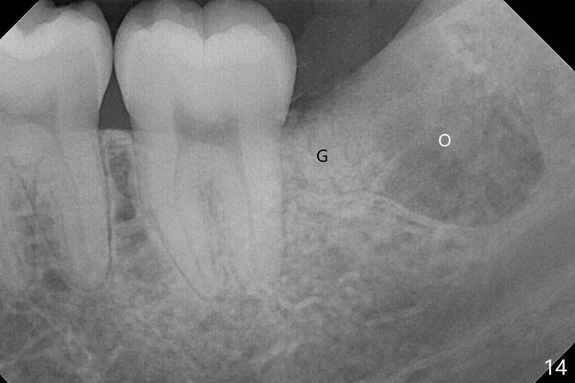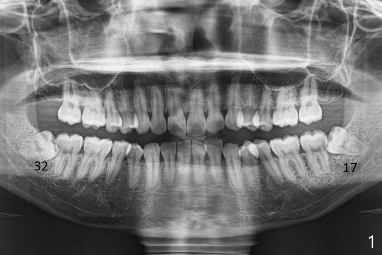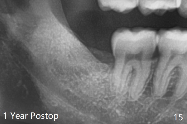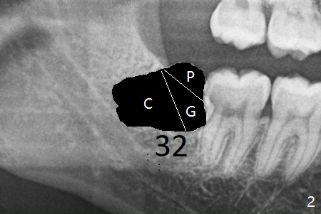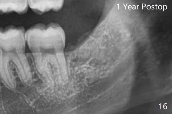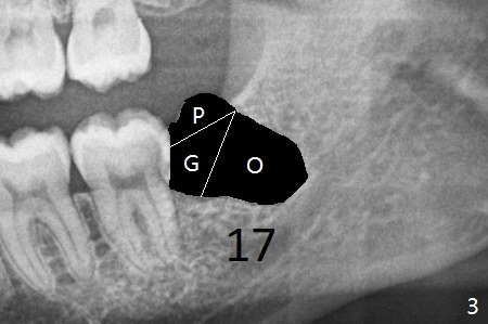 A 28-year-old woman returns for #17 and 32 extraction. To obtain full potential of bone regeneration after extraction, 3 D Bond (Graft Binder Cement, .5 cc, Fig.2 C) will be placed in the root portion of the socket of #32 , while allograft (G) and Collagen Plug (P) in the coronal one. For comparison, Osteogen Plug (Fig.3 O) will be inserted in the root portion of the socket of #17, while the other two materials same as those at #32. Take postop panoramic bitewing if both teeth are extracted. Otherwise take PA. Place the latter in the center of the extraction socket.
