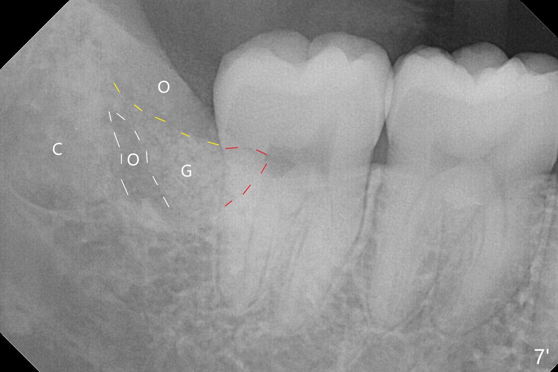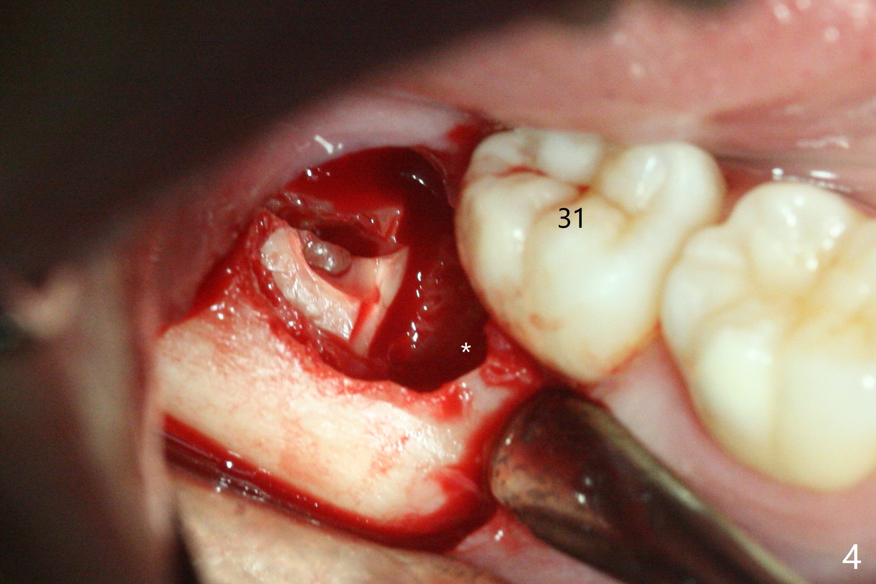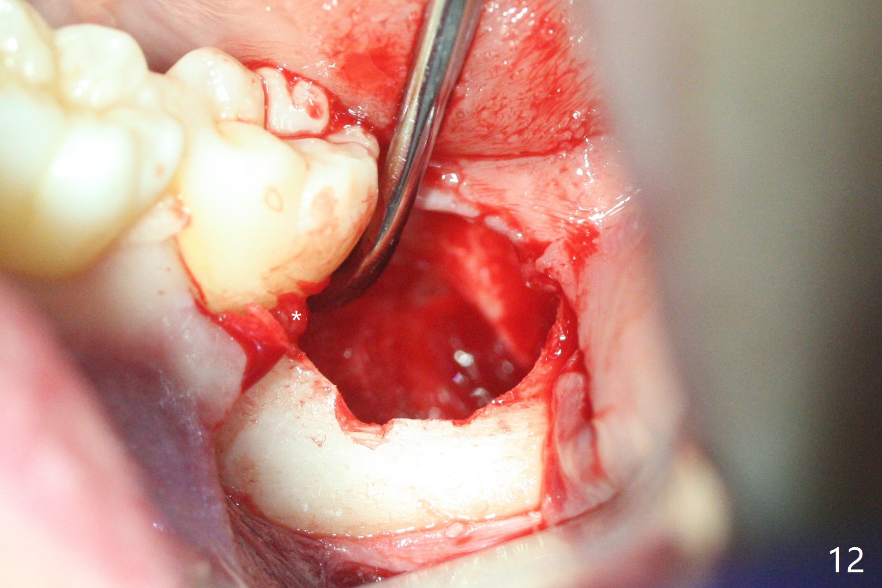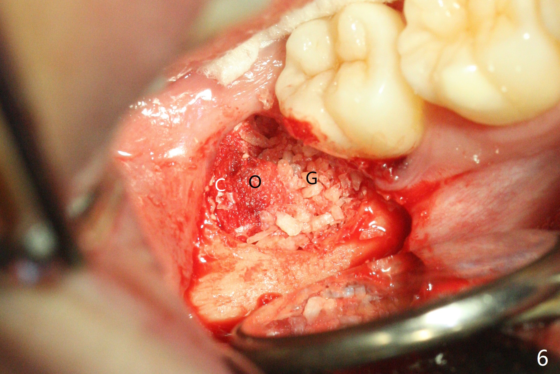 In fact the tooth #32 is extracted first; the defect involves the distobuccal aspect of the tooth #31 (Fig.4 *). An intraop PA is taken after extraction to confirm whether a broken surgical fissure bur tip retains or not; the distal lamina dura of #31 is low (Fig.5 *). It is expected to increase after cocktail bone graft (Fig.5' arrow). As planned, the bone cement (Fig.6 C) and allograft (G) are placed in the distal and mesial portions of the socket; between them is Osteogen Plug (O). Another piece of Osteogen Plug (as collagen membrane for bone graft) is placed on the top of the socket before suturing with 4-0 Plain Gut (Fig.7,7' O). Also note the bone graft being placed distobuccal (CT study) to #31 (Fig.7' red dashed line) to reduce possibility of future periodontitis. The patient returns 15 days postop with chief complaint of mild pain since extraction, although the wound looks normal. The transverse cortex connecting to the lamina dura (Fig.5 *) is obliterated when allograft is placed (Fig.7 G). The part of the graft remains in place 1 month postop (Fig.9) in spite of wound dehiscence (Fig.8). The bone graft loss is indicated by the fact of the reappearance of the transverse cortex (Fig.9). In the same appointment, the tooth #17 (Fig.10) is being extracted (Fig.11), leaving a defect mesiobuccal (Fig.12 *) to distal (curette). Part of Osteogen plug (Fig.13 O) is stretched to cover the mesially placed allograft (Fig.14 G). One quarter of Collagen plug is placed over the Osteogen plug (Fig.13 O) before 4-0 PGA suturing. There is bone regeneration 1 year postop (Fig.15,16).