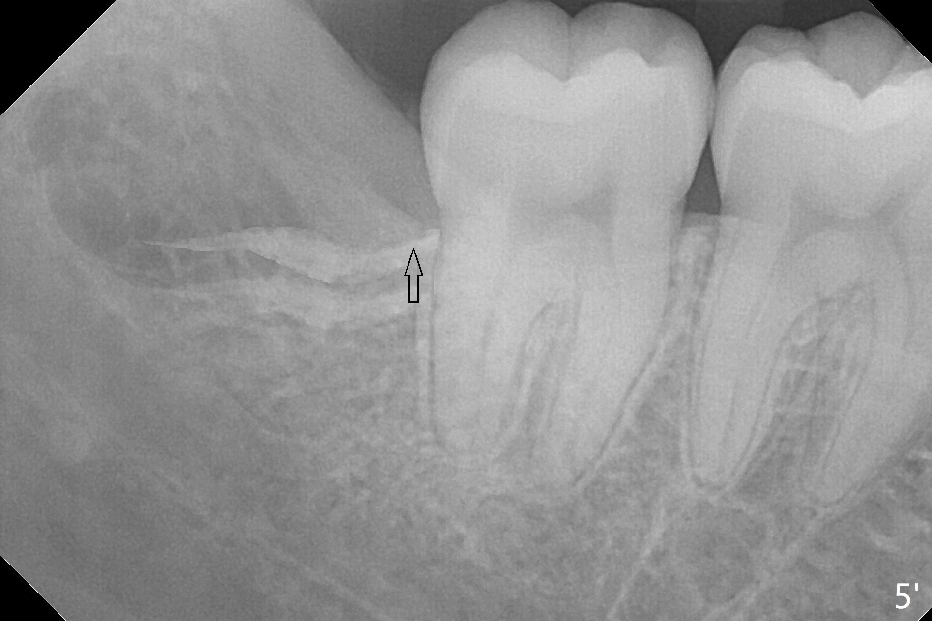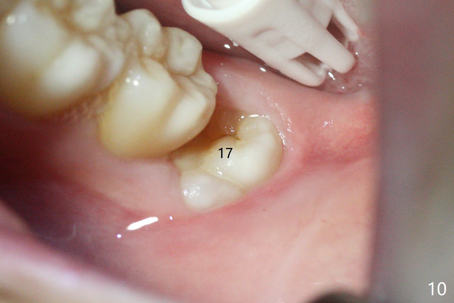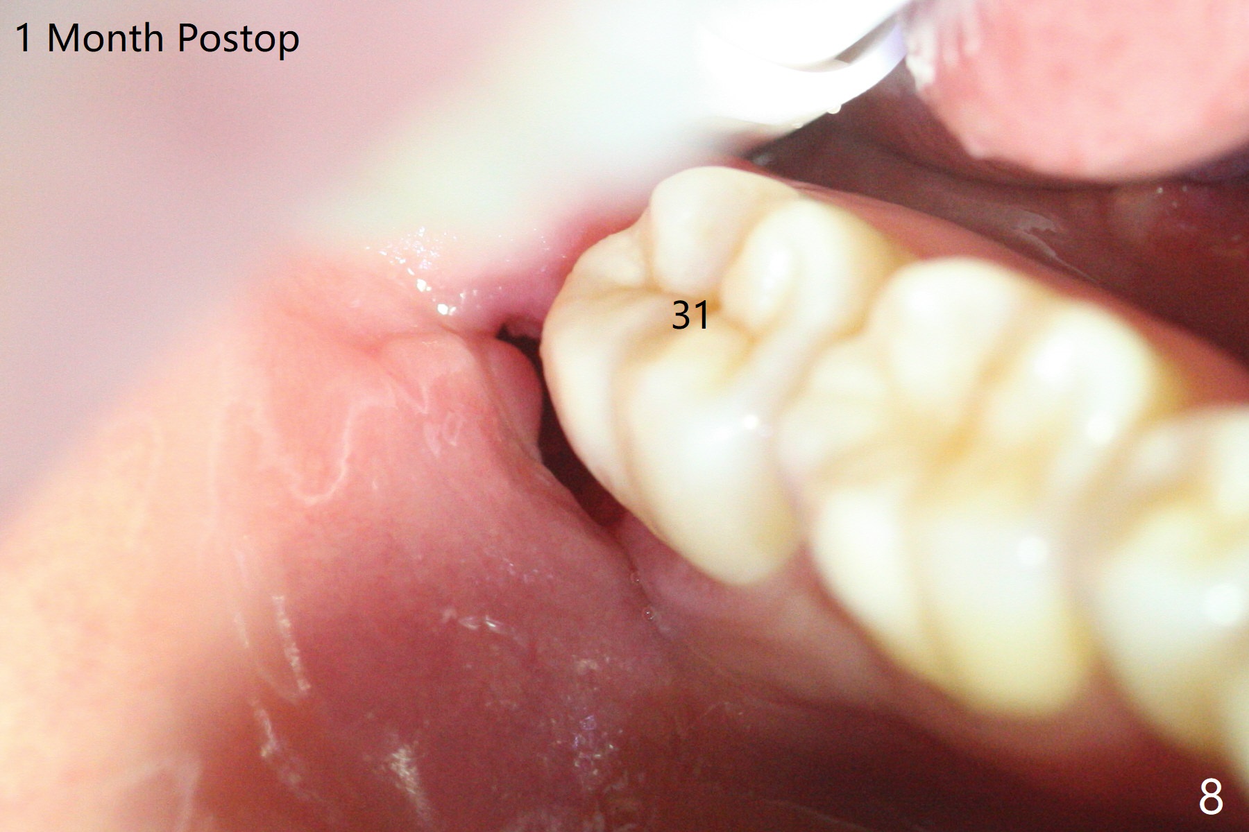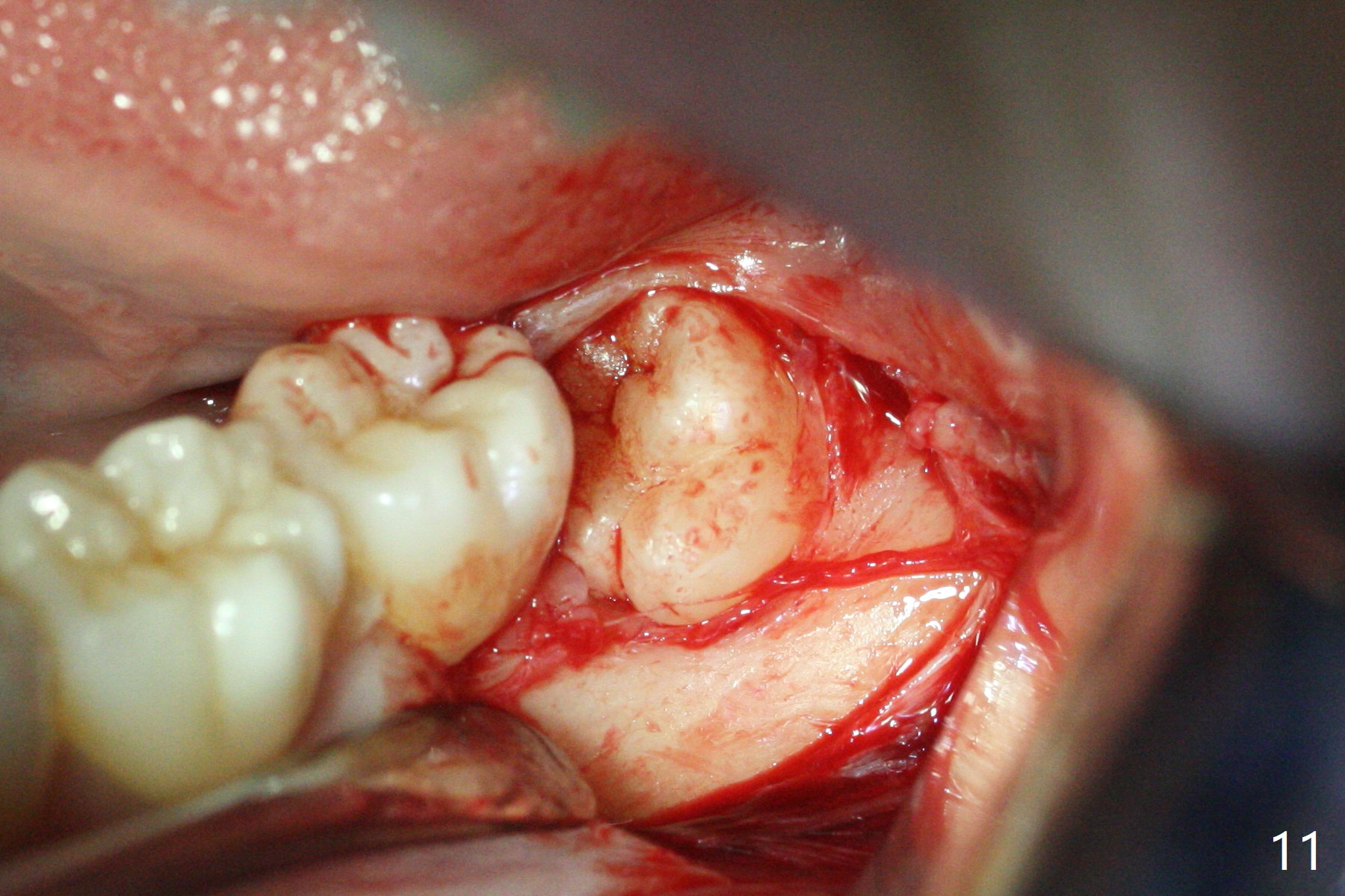In fact the tooth #32 is extracted first; the defect involves the distobuccal aspect of the tooth #31 (Fig.4 *). An intraop PA is taken after extraction to confirm whether a broken surgical fissure bur tip retains or not; the distal lamina dura of #31 is low (Fig.5 *). It is expected to increase after cocktail bone graft (Fig.5' arrow). As planned, the bone cement (Fig.6 C) and allograft (G) are placed in the distal and mesial portions of the socket; between them is Osteogen Plug (O). Another piece of Osteogen Plug (as collagen membrane for bone graft) is placed on the top of the socket before suturing with 4-0 Plain Gut (Fig.7,7' O). Also note the bone graft being placed distobuccal (CT study) to #31 (Fig.7' red dashed line) to reduce possibility of future periodontitis. The patient returns 15 days postop with chief complaint of mild pain since extraction, although the wound looks normal. The transverse cortex connecting to the lamina dura (Fig.5 *) is obliterated when allograft is placed (Fig.7 G). The part of the graft remains in place 1 month postop (Fig.9) in spite of wound dehiscence (Fig.8). The bone graft loss is indicated by the fact of the reappearance of the transverse cortex (Fig.9). In the same appointment, the tooth #17 (Fig.10) is being extracted (Fig.11), leaving a defect mesiobuccal (Fig.12 *) to distal (curette). Part of Osteogen plug (Fig.13 O) is stretched to cover the mesially placed allograft (Fig.14 G). One quarter of Collagen plug is placed over the Osteogen plug (Fig.13 O) before 4-0 PGA suturing. There is bone regeneration 1 year postop (Fig.15,16).