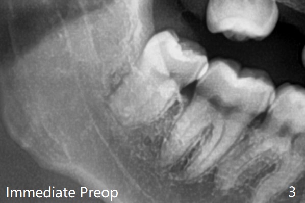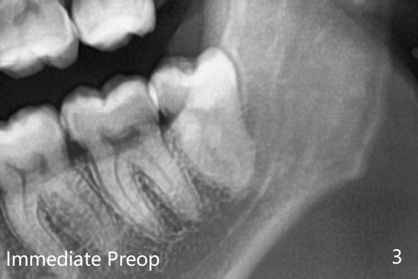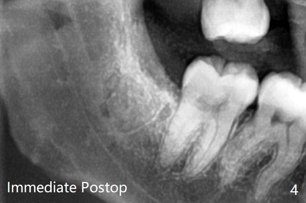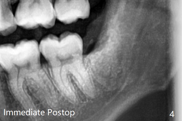 每个牙槽窝放置0.5cc骨水泥(Bone Cement (Bond Apatite from Augma)),覆盖半块胶原塞,4-0铬羊肠线缝合(图四)。