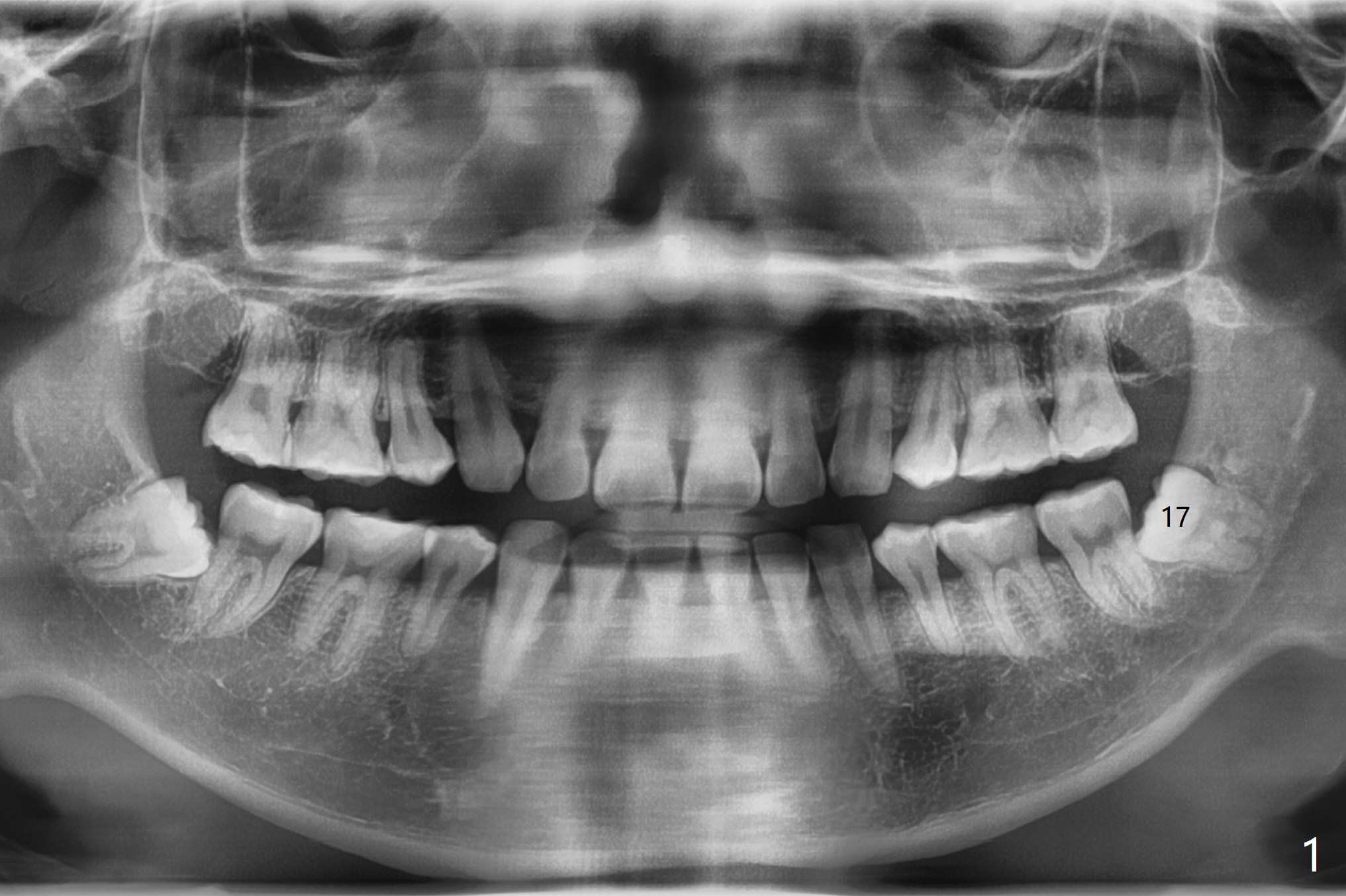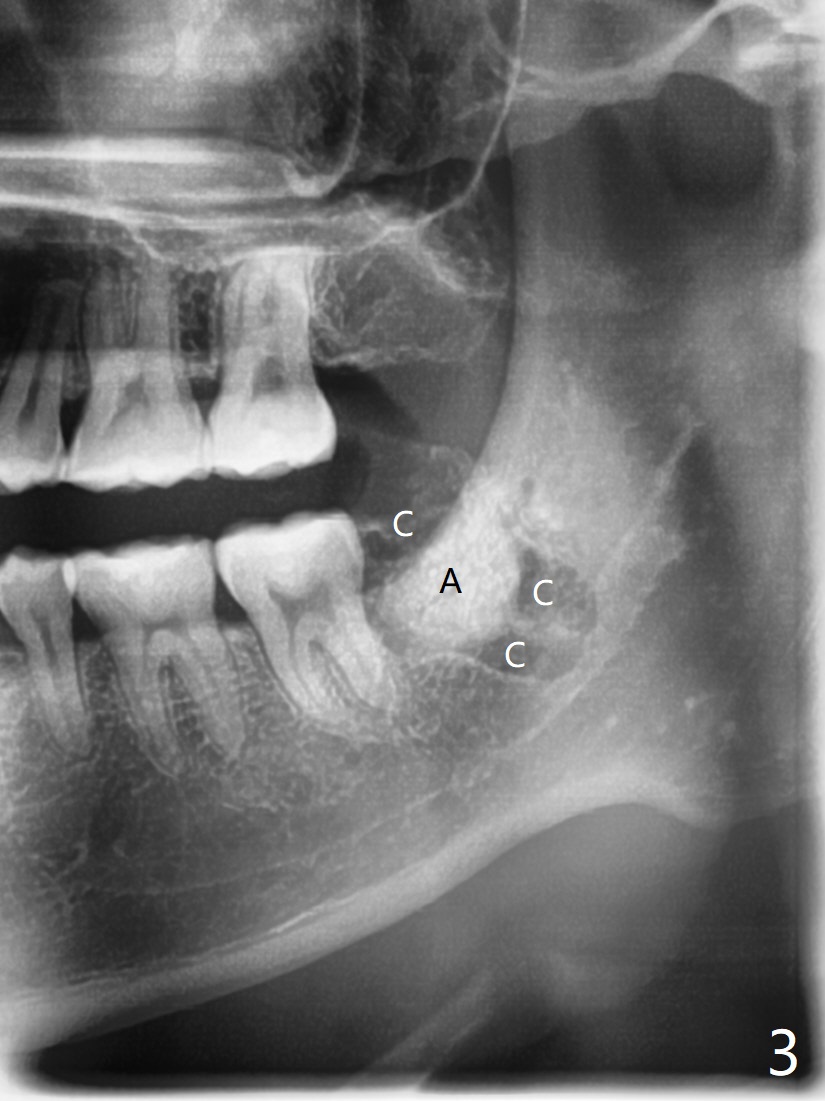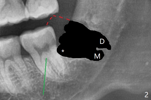 A 27-year-old man requests extraction of the tooth #17. Immediately following 4Q SRP (Fig.1), a midbuccal incision is made (Fig.2 green line) to reduce the chance of graft exposure in case of wound dehiscence because of nearly horizontal impaction of #17. The crown of the latter may be slight mesial to the distal surface of the tooth #18. In fact this is the case after flaps are raised. Since the socket is expected to be large, the graft will be placed immediately distal to the tooth #18 (Fig.2 *), while collagen plug (Fig.3,4 C) will be placed in the root portion of the socket (Fig.2 M, D (mesial and distal)) and in the gingival area (red dashed line to prevent graft material escape). Return to Plug Cement Xin Wei, DDS, PhD, MS 1st edition 06/22/2020, last revision 06/25/2020