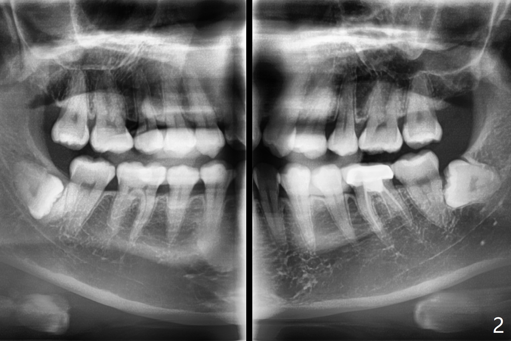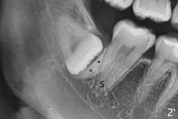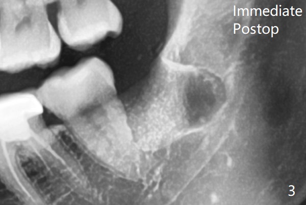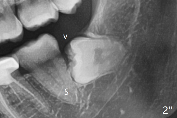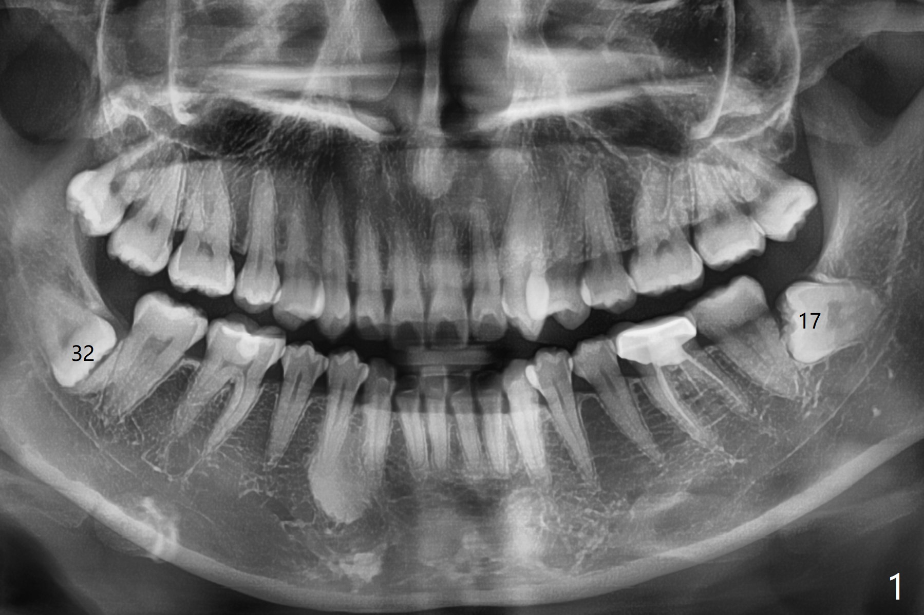 A 31-year-old woman returns with chief complaint of "occasional, mild pain in the lower left 3rd molar" 1 year post extraction of #1 and 16 (Fig.1,2). The lower 2nd molars appears to have a single fused root (Fig.2',2'' S); the radiopaque image mesial to the tooth #32 must be the dense bone (Fig.2' *). In contrast the cortex coronal to the tooth #17 is lacking (Fig.2'' v), as compared to that in Fig.2'. It seems that the bone loss at #17 is associated with mild pericoronitis. The tooth #17 should be extracted with placement of Bond Apatite to repair #18 distal defect. In fact sticky bone and collagen plug are placed instead (Fig.3), covered by 2 pieces of PRF.