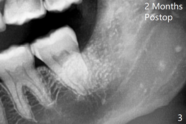 7和8之间只有一层骨皮质(图一:>),8拔除后(图一’),7远中骨质可能退缩,所以植骨尤其重要。医用石膏(Bond Apatite,图二),表面放置1/2胶原塞,4-0 PGA缝合。术后两个月回来拔除左上8(“刺激颊粘膜”,其实远中牙龈红肿),临床上左下8近中颊侧仍有一个小开口,石膏与骨质界限开始不清楚了(图三)。