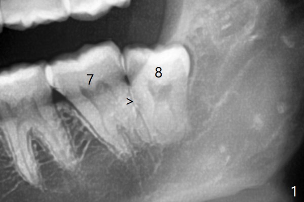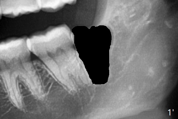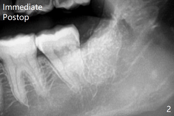 7和8之间只有一层骨皮质(图一:>),8拔除后(图一’),7远中骨质可能退缩,所以植骨尤其重要。医用石膏(Bond Apatite,图二),表面放置1/2胶原塞,4-0 PGA缝合。