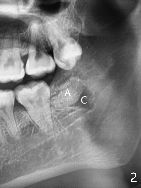 A 24-year-old woman with poor oral hygiene presents to clinic requesting extraction of the tooth #17 (Fig.1). The tooth is removed after multiple sectioning. One half of collagen plug is placed in the bottom of the socket (Fig.2 C, while 1 cc of Bond Apatite in the coronal portion of the socket (A). The other half of the collagen plug is placed on the top of the cement before suturing with 4/0 PGA. The patient feels pain when the tooth is wiggled heavily. But the Inferior Alveolar Canal is not exposed when the tooth is out. Return to Plug Cement Xin Wei, DDS, PhD, MS 1st edition 07/14/2020, last revision 07/14/2020