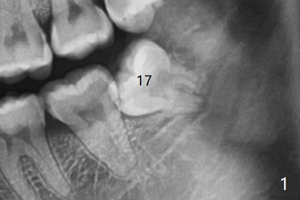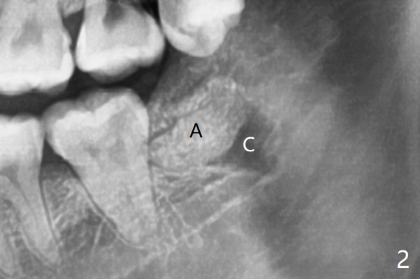 A 24-year-old woman with poor oral hygiene presents to clinic requesting extraction of the tooth #17 (Fig.1). The tooth is removed after multiple sectioning. One half of collagen plug is placed in the bottom of the socket (Fig.2 C, while 1 cc of Bond Apatite in the coronal portion of the socket (A). The other half of the collagen plug is placed on the top of the cement before suturing with 4/0 PGA. The patient feels pain when the tooth is wiggled heavily. But the Inferior Alveolar Canal is not exposed when the tooth is out.