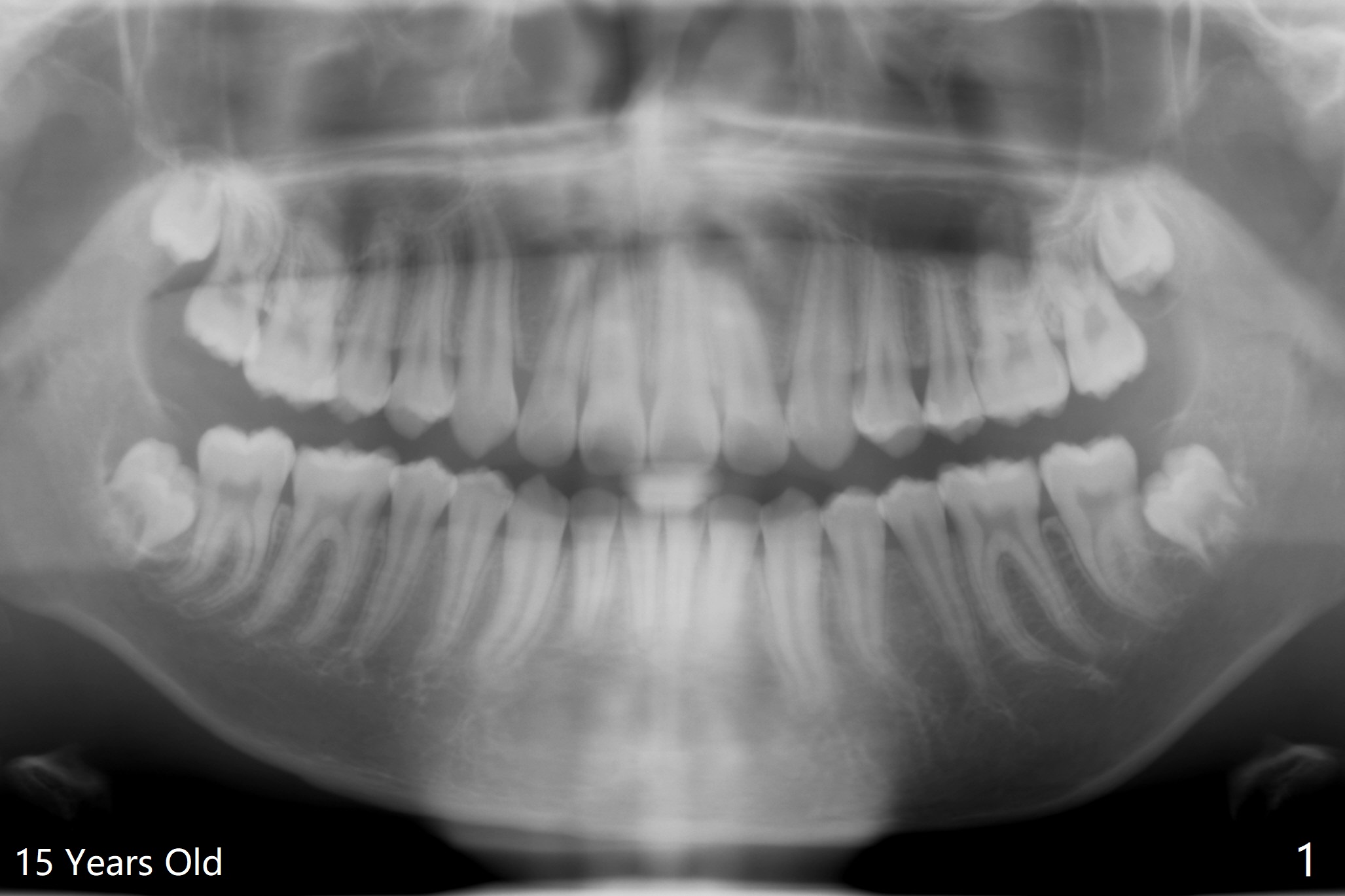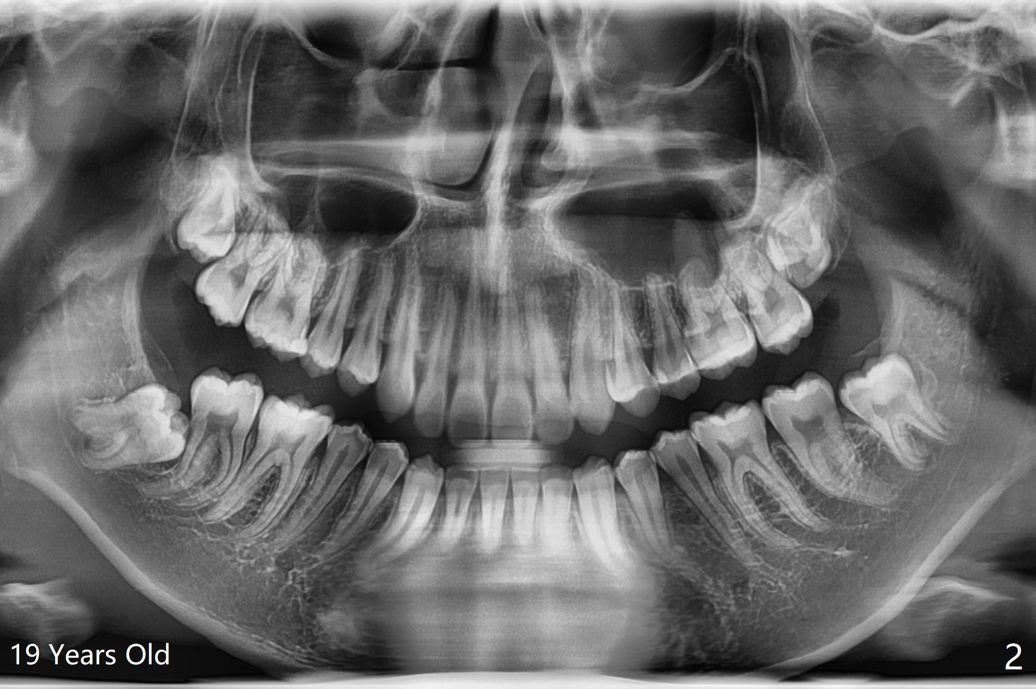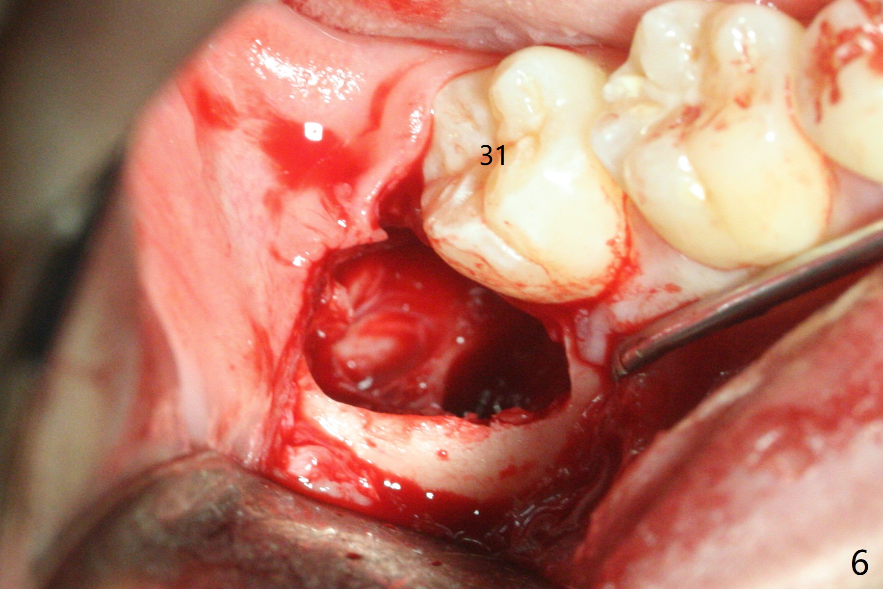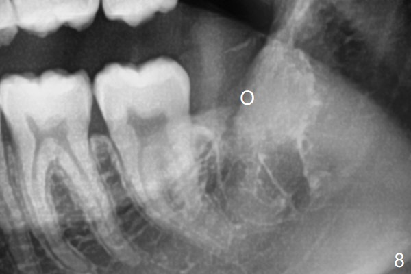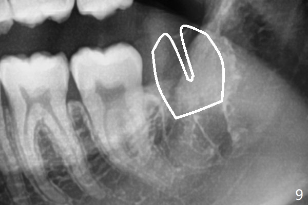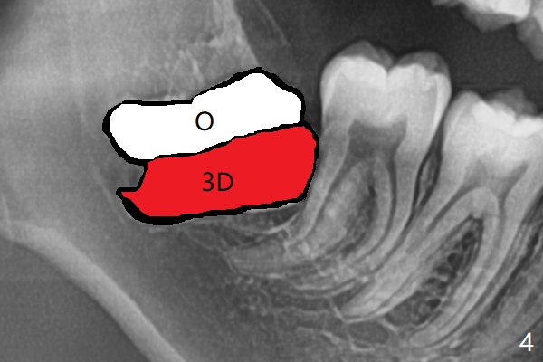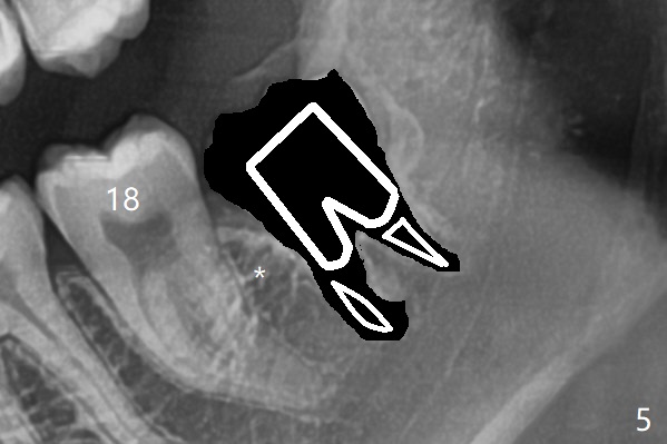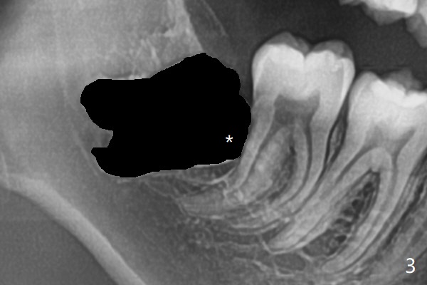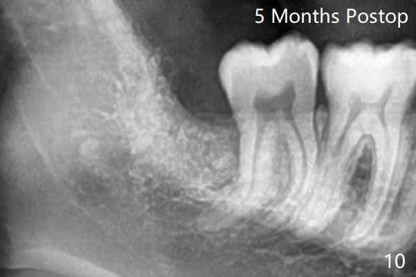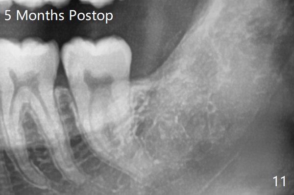 A 19-year-old man returns for #1,16,17 and 32 extraction (Fig.1,2). Because of horizontal impaction of #32 and no bone #31 distal post extraction (Fig.3 *), 3D bond (.5 cc) will be placed in the mesial socket of #32 (Fig.4 red), while Osteogen plug (1/2 (O)) in the distal one. Since there is no bony defect between #17 and 18 after extraction (Fig.5 *), a piece of Osteogen plug (cut half apical) will be inserted in #17 socket, whereas 2 small pieces of Osteogen plug placed in the apical portions (triangle and spindle shaped). Take posterior panoramic X-ray postop (bitewing type, CT format, not XV). There appears bone formation in the socket 5 months postop (Fig.10,11).